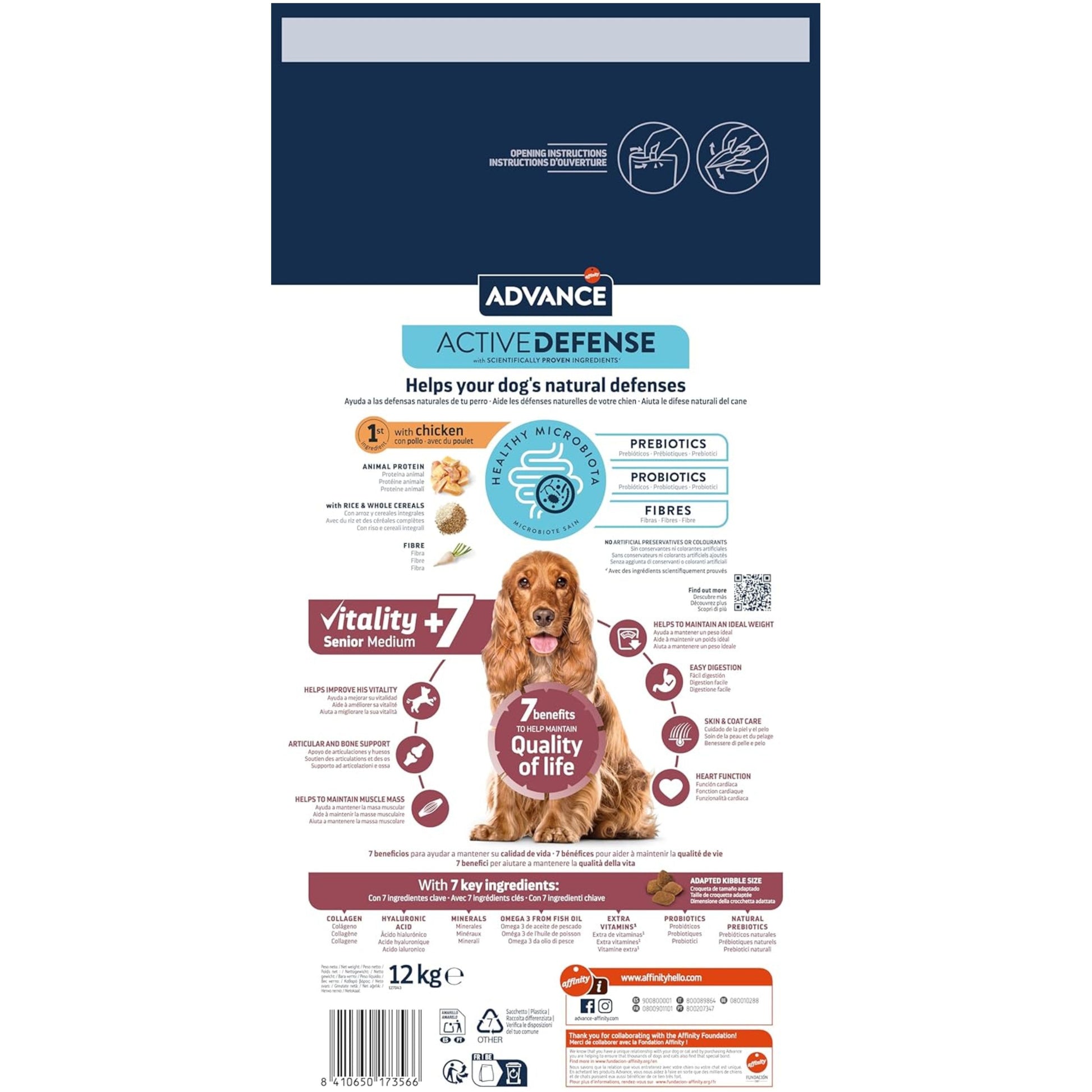 Pienso para perros Advance Senior para animales de raza mediana mayores de 7 añosAdvance Medium Senior es un alimento de alta gama especialmente indicado para perros de más de 7 años de raza mediana, que se adapta perfectamente al ritmo de vida más sedentario de los animales a estas edades. Está indicado para las razas medianas ya que es un alimento que se adapta a sus mandíbulas y dientes.La acción combinada de la condroitina y la glucosamina ayuda a prevenir la aparición de problemas en las articulaciones asociadas a los perros senior. El bajo nivel de calorías impide que tu mascota coja peso por la falta de ejercicio. También incluye taurina, un aminoácido que cuida la salud del corazón de tu perro.La presencia de polifenoles naturales en este alimento contribuye a retrasar el envejecimiento celular, y las proteínas naturales mejoran la salud intestinal de tu perro. Este pienso se presenta en forma de croqueta mediana para que se mastique más fácilmente. Además, la incorporación de ácidos grasos omega 3 y DHA ayudan a mantener la actividad cognitiva de tu mascota.VENTAJAS:Alimento para perros de más de 7 años de raza mediana (10 a 30 kg de peso adulto).Ayuda a la prevención de problemas articulares.Facilita el control o la pérdida de peso de tu mascota por su bajo nivel de calorías.Incluye ácidos grasos omega 3 y DHA que mantienen la actividad cognitiva.Las proteínas naturales ayudan a mantener la salud intestinal.USO Y ESPECIFICACIONES:Pienso indicado para la correcta alimentación de perros de más de 7 años de raza mediana.Servir el pienso seco o ligeramente húmedo.Descripción nutricional:Ingredientes: pollo (14%), harina de gluten de maíz, trigo, proteínas deshidratadas de aves, arroz (10%), maíz, harina de maíz, proteínas animales hidrolizadas, salvado de maíz, pulpa de remolacha, grasas animales (estabilizadas con vitamina E), huevo deshidratado, levadura, aceite de pescado, cloruro potásico, proteínas plasmáticas, difosfato de tetrasodio, glucosamina, sulfato de condroitina, polifenoles naturales.Componentes analíticos: proteína bruta (27.0%), materias grasas brutas (13%), fibras brutas (2.5%), materia inorgánica (6%), calcio (1.1 %), fósforo (0.8%), humedad (9%).Aditivos: vitamina A (27000 UI), vitamina D3 (1800 UI), vitamina E (alfa- tocoferol) (830 mg), vitamina C (500 mg), sulfato férrico monohidratado (260 mg) (hierro 85 mg), yoduro de potasio (1.9 mg) (yodo 1.4 mg), sulfato de cobre pentahidratado (34 mg) (cobre 8.8 mg), sulfato manganoso monohidratado (124 mg) (manganeso 40 mg), sulfato de zinc monohidratado (395 mg) (zinc 144 mg), selenito sódico (0.24 mg) (0.11 mg), taurina (1200 mg/Kg).Dosificación:Estas indicaciones son orientativas, es aconsejable adaptar la ración diaria de tu mascota a sus características específicas.PESOBAJA ACTIVIDADMEDIA ACTIVIDADALTA ACTIVIDAD10 kg150 g185 g225 g15 kg200 g250 g300 g20 kg250 g310 g375 g25 kg300 g375 g450 g30 kg340 g425 g510 gTamaño y formato:Disponible en envases de 3 y 12 kg.