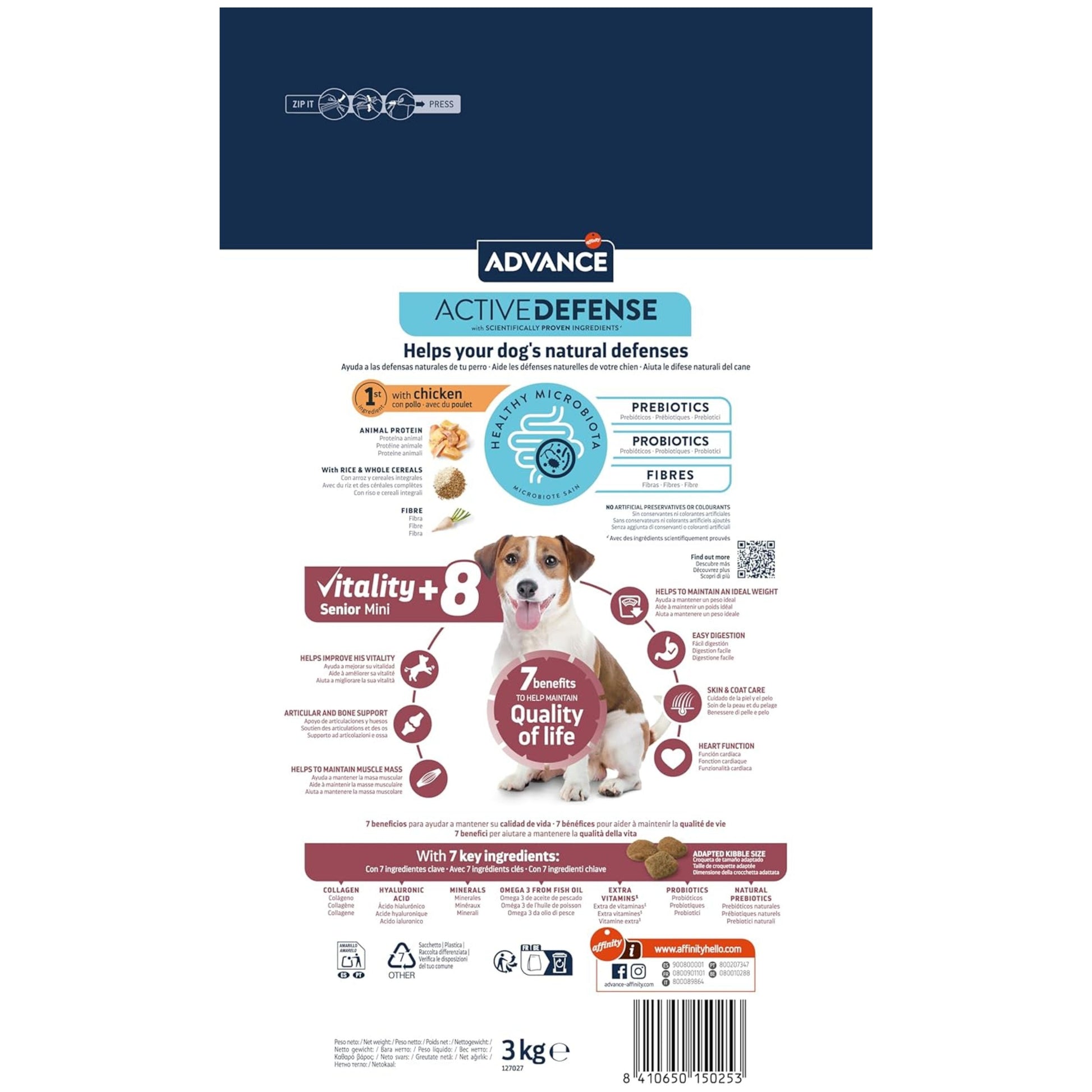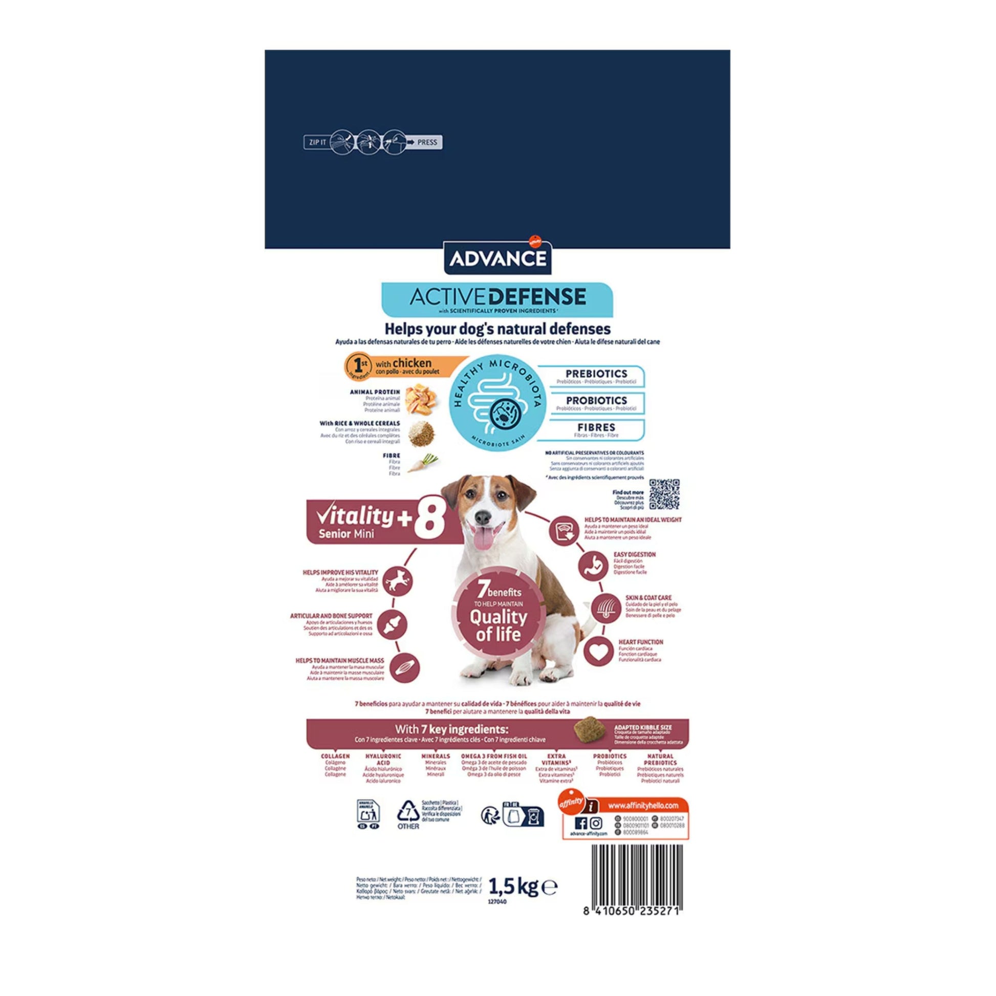 El pienso para perros de raza pequeña Affinity Advance Mini Senior 8+ es un alimento de alta gama formulado especialmente para cubrir las necesidades nutricionales específicas de perros que no alcancen más de 10 kg de peso en edad adulta y que superen los 8 años de edad.Al alcanzar la edad senior, la actividad de los perros se reduce considerablemente, por ello la receta del alimento de Advance cuenta con un bajo contenido en calorías, lo que permite un mejor control del peso del perro o una reducción del mismo, todo manteniendo una correcta masa muscular. La receta cuenta con L-Carnitina, que ayuda a transformar la grasa en energía y que también ayuda a combatir la obesidad.Al tratarse de un pienso especializado para perros de raza pequeña, la croqueta es más pequeña, siendo así perfecta para las mandíbulas y la boca de los perros de este tipo de raza.Características:Alto contenido en fibra y proteínas y bajo en calorías para el control o pérdida de peso del perro sin que pierda masa muscular. Incluye polifenoles naturales que ayudan a retrasar el envejecimiento celular. L-Carnitina que ayuda a transformar la grasa en energía, favoreciendo la reducción de los depósitos grasos del perro. Favorece el mantenimiento de la actividad cognitiva y del funcionamiento del corazón de tu mascota gracias a los ácidos grasos Omega 3 y a la taurina. Adaptado a las mandíbulas y dientes de los perros de raza pequeña.Composición:Pollo (16%), harina de gluten de maiz, proteínas deshidratadas de ave, trigo, arroz (10%), harina de trigo, maíz, proteínas animales hidrolizadas, grasa animal, pulpa de remolacha, salvado de maíz, huevo deshidratado, levadura, aceite de pescado, cloruro potásico, proteínas plasmáticas, carbonato de calcio, difosfato de tetrasodio, glucosamina, sulfato de condroitina, polifenoles naturales.Aditivos nutricionales: Vitamina A, Vitamina D3, Vitamina E, Vitamina C, Taurina, sulfato férrico monohidratado, oduro de potasio, sulfato de cobre pentahidratado, sulfato manganoso monohidratado, sulfato de zinc monohidratado, selenito sódico. Análisis medio:Proteínas 28%, grasas 15%, fibras brutas 2.5%, materia inorgánica 6%, Calcio 1.1%, Fósforo 0.8%, humedad 9%