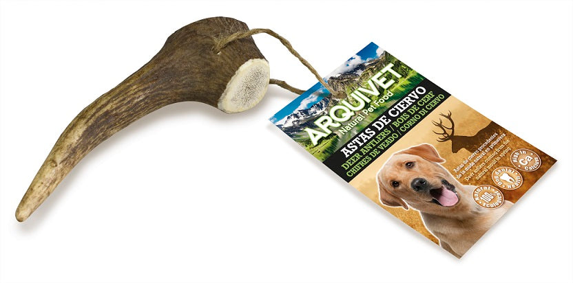 Astas de ciervo procedentes de la muda natural en primavera. Se recogen del bosque se limpian sólo con agua, se cortan y se lijan. Ningún químico entra en el proceso.Son hipoalérgicas: no contienen ningún elemento que active alergias caninas. No contienen cereales, ni gluten. Al mascar el asta se deshace en granos pequeños generando un efecto arenoso que fricciona contra el sarro y la placa, como si fuera un cepillo de dientes.Contenido calórico inexistente.Mantener en lugar fresco y seco. Los perros deben estar bajo supervisión mientras mastican el asta y disponer siempre de agua limpia y fresca.Ingredientes: 100% asta de ciervo.Composición analítica: Proteína bruta 36%, grasa bruta 0,1%, fibra 2%, ceniza bruta 56%, cálcio 20%, fósforo 9%.
