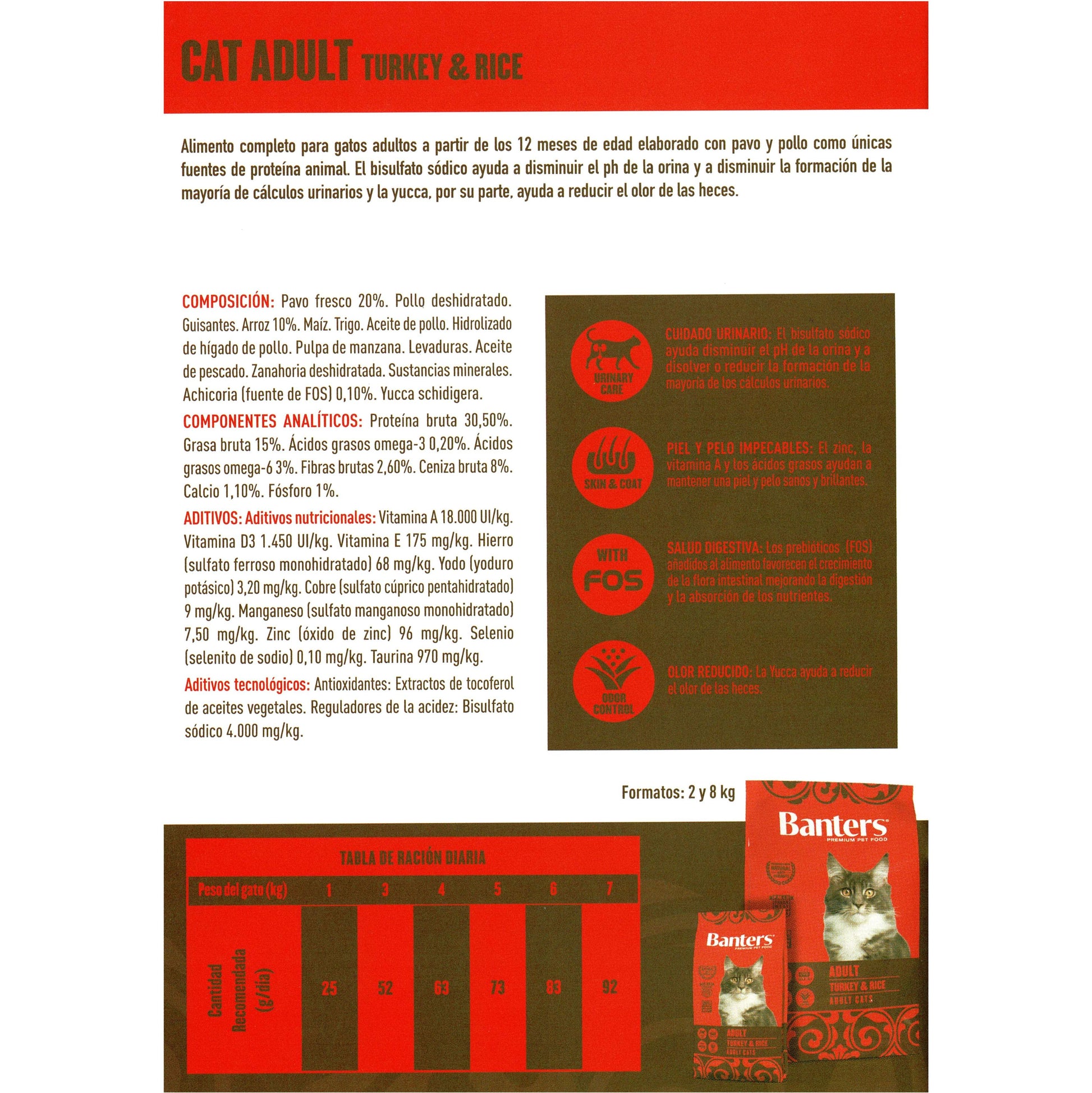 Banters Adult Cat Pavo y ArrozAlimento completo para gatos adultos a partir de los 12 meses de edad elaborado con pavo y pollo como únicas fuentes de proteína animal. El bisulfato sódico ayuda a disminuir el ph de la orina y a disminuir la formación de la mayoría de cálculos urinarios y la yucca, por su parte, ayuda a reducir el olor de las heces.COMPOSICIÓN: Pavo fresco 20%. Pollo deshidratado. Guisantes. Arroz 10%. Maíz. Trigo. Aceite de pollo. Hidrolizado de hígado de pollo. Pulpa de manzana. Levaduras. Aceite de pescado. Zanahoria deshidratada. Sustancias minerales. Achicoria (fuente de FOS) 0,10%. Yucca schidigera.COMPONENTES ANALÍTICOS: Proteína bruta 30,50%. Grasa bruta 15%. Ácidos grasos omega-3 0,20%. Ácidos grasos omega-6 3%. Fibras brutas 2,60%. Ceniza bruta 8%. Calcio 1,10%. Fósforo 1%.ADITIVOS: Aditivos nutricionales: Vitamina A 18.000 UI/kg. Vitamina D3 1.450 UI/kg. Vitamina E 175 mg/kg. Hierro (sulfato ferroso monohidratado) 68 mg/kg. Yodo (yoduro potásico) 3,20 mg/kg. Cobre (sulfato cúprico pentahidratado) 9 mg/kg. Manganeso (sulfato manganoso monohidratado) 7,50 mg/kg. Zinc (óxido de zinc) 96 mg/kg. Selenio (selenito de sodio) 0,10 mg/kg. Taurina 970 mg/kg.Aditivos tecnológicos: Antioxidantes: Extractos de tocoferol de aceites vegetales. Reguladores de la acidez: Bisulfato sódico 4.000 mg/kg.CUIDADO URINARIO: El bisulfato sódico ayuda disminuir el pH de la orina y a disolver o reducir la formación de la mayoría de los cálculos urinarios.PIEL Y PELO IMPECABLES: El zinc, la vitamina A y los ácidos grasos ayudan a mantener una piel y pelo sanos y brillantes.SALUD DIGESTIVA: Los prebióticos (FOS) añadidos al alimento favorecen el crecimiento de la flora intestinal mejorando la digestión y la absorción de los nutrientes.OLOR REDUCIDO: La Yucca ayuda a reducir el olor de las heces.