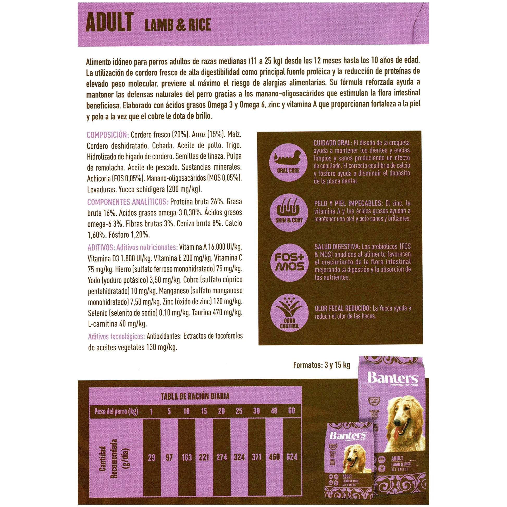 Banters Adult Lamb & RiceALIMENTO COMPLETO para PERROS ADULTOSAlimento idóneo para perros adultos de razas medianas (11 a 25 kg) desde los 12 meses hasta los 10 años de edad. La utilización de carne de cordero fresca de alta digestibilidad como principal fuente protéica y la reducción de proteínas de elevado peso molecular, previene al máximo el riesgo de alergias alimentarias. Su fórmula reforzada ayuda a mantener las defensas naturales del perro gracias a los mananooligosacáridos que estimulan la flora intestinal beneficiosa. Elaborado con ácidos grasos Omega 3 y Omega 6, zinc y vitamina A que proporcionan fortaleza a la piel y pelo a la vez que el cobre la dota de brillo.INGREDIENTES: Cordero freso (20%), Arroz (15%), Maiz, Cordero deshudratado, Cebada, Aceite de pollo, Trigo, Hidrolizado de higado de cordero, Semillas de Linaza, Pulpa de Remolacha, Aceite de pescado, Sustancias minerales, Achicoria (FOS 0.05%), Manano-oligosacaridos (MOS 0.05%), Levaduras, Yucca schidigera (200mg/kg)CONSTITUYENTES ANALITICOS: Proteína bruta 26,00 %, grasas brutos 16,00 %, acidos grasos Omega-3 0.30%, Acido grasos Omega-6 3%, Fibras brura 3%, Ceniza bruta 8%, Calcio 1.6%, Fosforo 1.20%ADITIVOS NUTRICIONALES:Vitamina A 16.000 UI/Kg. Vitamina D3 1.800 UI/Kg. Vitamina E 200 mg/Kg. Hierro (sulfato monohidratado) 75 mg/Kg. Yodo (Yoduro pota´sico) 3,5 mg/Kg. Cobre (Sulfato pentahidratado) 10 mg/Kg. Manganeso (sulfato monohidratado) 7,5 mg/Kg. Zinc (oxido) 150 mg/Kg. Selenio 0,2 mg/Kg. Taurina 470 mg/Kg. L- carnitina 40 mg/Kg.TECNOLOGICOS:Antioxidantes naturales (tocoferoles).Instrucciones de AlimentaciónAl realizar un cambio en la alimentación, se recomienda introducir gradualmente el nuevo alimento durante los 3 primeros días. Alimentar a la mascota con dos tomas diarias, según recomendación orientativa de la Tabla de Ración diaria. Su mascota puede comer más o menos dependiendo de su edad, temperamento y nivel de actividad. Disponer de agua fresca a libre disposición de la mascota. Conservar el producto en lugar fresco y seco.Tabla de Ración DiariaPesoGramosHasta 5 kg.49 - 97 g/día5 – 10 kg.97 - 163 g/día10 – 20 kg.163 - 274 g/día20 – 30 kg.274 – 371 g/día30 - 40 Kg. 371 - 460 g/día 40 - 50 Kg. 460 - 544 g/día 50 - 60 Kg. 544 - 624 g/día Beneficios- Mejora el sistema inmunitario gracias a los ácidos grasos esenciales Omega 3 y Omega 6- Favorece el tracto digestivo tras la combinación de los prebióticos: FOS y MOS- Protectores de piel y pelo gracias a la relación óptima Zinc, Cobre, Vitamina A y tocoferoles- Control del cuidado dental, Óptima relación calcio / fósforo en combinación con la fibra dietética- Carne fresca como la mejor fuente protéica que genera mayor digestibilidad y calidad del producto