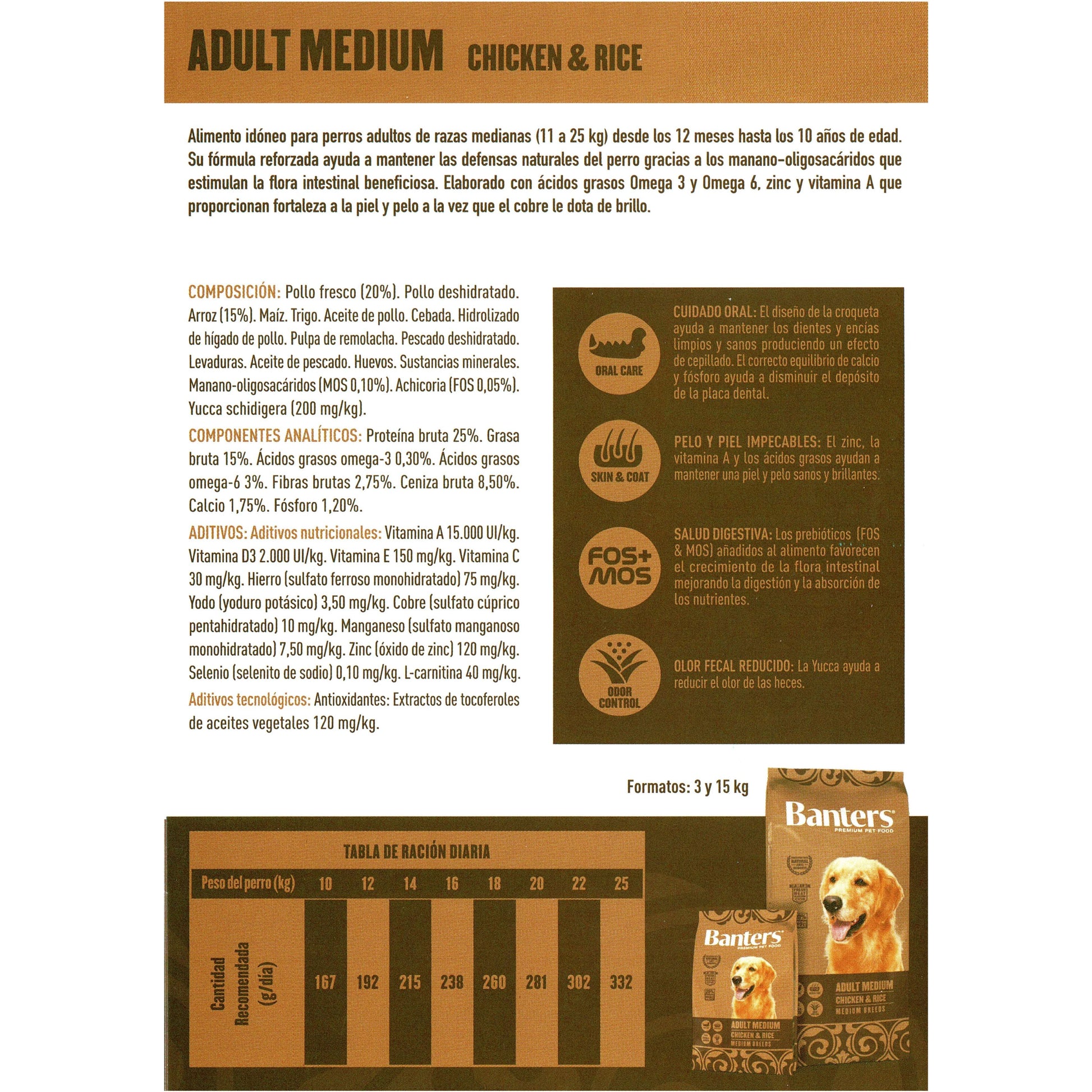 Banters Adult Chicken & RiceALIMENTO COMPLETO para PERROS ADULTOSAlimento idóneo para perros adultos de razas medianas (11 a 25 kg) desde los 12 meses hasta los 10 años de edad. Su fórmula reforzada ayuda a mantener las defensas naturales del perro gracias a los mananooligosacáridos que estimulan la flora intestinal beneficiosa. Elaborado con ácidos grasos Omega 3 y Omega 6, zinc y vitamina A que proporcionan fortaleza a la piel y pelo a la vez que el cobre le dota de brillo.Ingredientes: Pollo fresco > 20%, mai´z, harina de ave, arroz, aceite de ave, trigo, cebada, hidrolizado de hi´gado de ave, pulpa de remolacha, levadura, harina de pescado, minerales, huevo, achicoria, manano-oligo-saca´ridos, cloruro so´dico, extracto de yuccaConstituyentes analíticos: Protei´na bruta 25,00%, aceites y grasas brutos 15,00 %, fibras brutas 2,75 %, ceniza bruta 9,00 %, calcio 1,75 %, fo´sforo 1,20%Aditivos: NUTRICIONALES:Vitamina A 15.000 UI/Kg. Vitamina D3 2.000 UI/Kg. Vitamina E 150 mg/Kg. Hierro (sulfato monohidratado) 75 mg/Kg. Yodo (Yoduro pota´sico) 3,5 mg/Kg. Cobre (Sulfato pentahidratado) 10 mg/Kg. Manganeso (sulfato monohidratado) 7,5 mg/Kg. Zinc (oxido) 150 mg/Kg. Selenio 0,2 mg/Kg. L-carnitina 40 mg/Kg.TECNOLO´GICOS:Antioxidantes naturales (tocoferoles).Instrucciones de AlimentaciónAl realizar un cambio en la alimentación, se recomienda introducir gradualmente el nuevo alimento durante los 3 primeros días. Alimentar a la mascota con dos tomas diarias, según recomendación orientativa de la Tabla de Ración diaria. Su mascota puede comer más o menos dependiendo de su edad, temperamento y nivel de actividad. Disponer de agua fresca a libre disposición de la mascota. Conservar el producto en lugar fresco y seco.Tabla de Ración DiariaPeso GramosHasta 5 Kg. 48 - 96 g/dia 5 - 10 Kg.96 - 161 g/día10 - 20 kg.161 - 270 g/día20 - 30 kg.270 - 366 g/día30 - 40 kg.366 - 454 g/día40 - 50 Kg.454 - 537 g/día 50 - 60 Kg. 537 - 616 g/día- Mejora el sistema inmunitario gracias a los ácidos grasos esenciales Omega 3 y Omega 6- Favorece el tracto digestivo tras la combinación de los prebióticos: FOS y MOS- Protectores de piel y pelo gracias a la relación óptima Zinc, Cobre, Vitamina A y tocoferoles- Control del cuidado dental, Óptima relación calcio / fósforo en combinación con la fibra dietética- Carne fresca como la mejor fuente protéica que genera mayor digestibilidad y calidad del producto