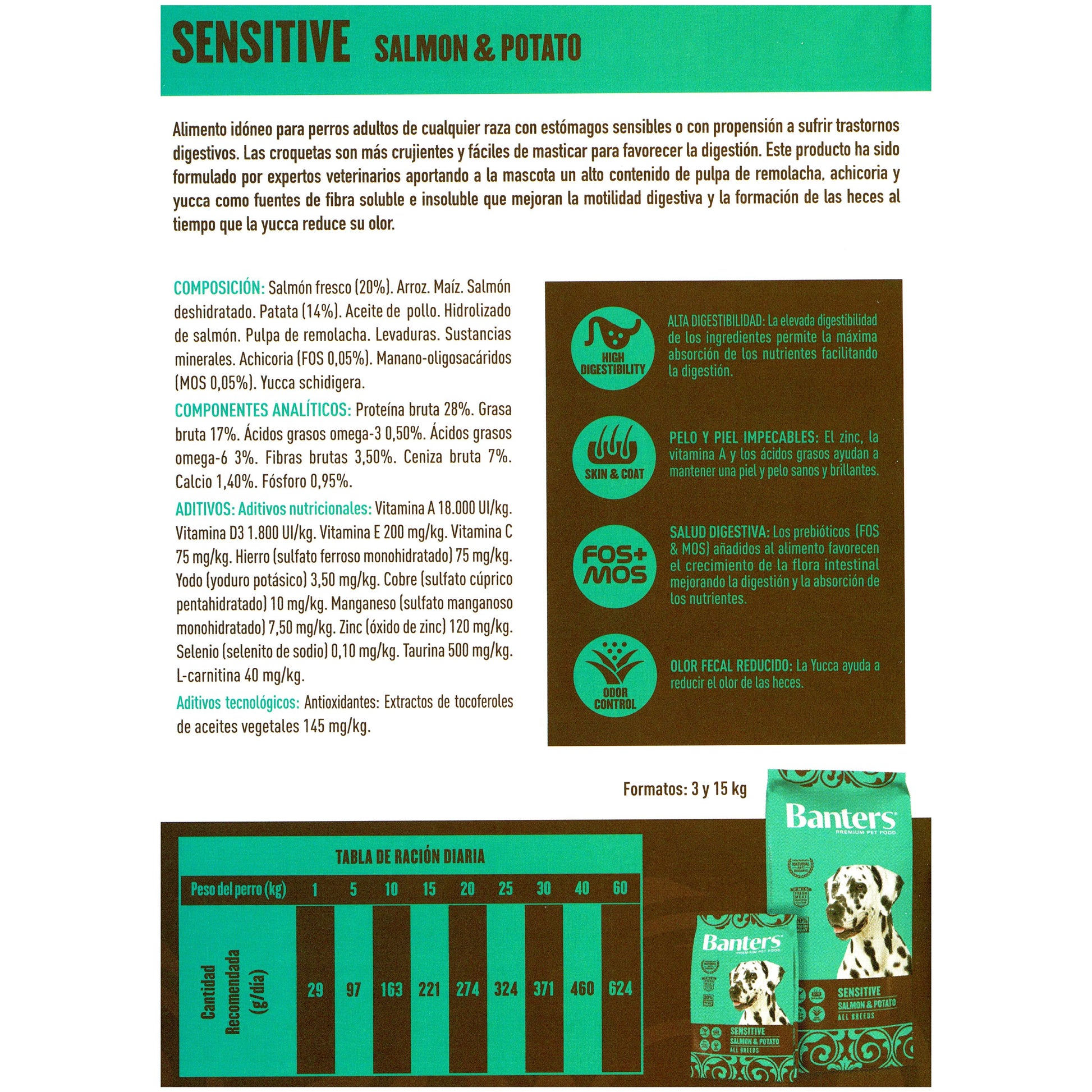 Banters Adult Sensitive es el alimento idóneo para perros adultos de cualquier raza con estómagos sensibles o con propensión a sufrir trastornos digestivos. Las croquetas son más crujientes y fáciles de masticar para favorecer la digestión. Este producto ha sido formulado por expertos veterinarios aportando a la mascota un alto contenido en arroz y avena, dos fuentes de fibra soluble e insoluble, para mejorar la motilidad digestiva y mejorar la formación de las heces.Ingredientes: Salmon Fresco (20%), Arroz, Maiz, Salmon deshidratado, Patata (14%), Aceite de pollo, Hidrolizado de salmon, Pulpa de remolacha, Levaduras, Sustancias minerales, Achicoria (FOS 0.05%), Manano-oligosacaridos (MOS 0.05%), Yucca schidigeraConstituyentes analíticos: Proteina bruta 28%, Grasa bruta 17%, Acidos grasos Omega-3 0.50%, Acidos grasos Omega-6 3%, Fibras bruta 3.50%, Ceniza bruta 7%, Calcio 1.40%, Fosforo 0.95%Aditivos: NUTRICIONALES:Vitamina A 18.000 UI/Kg. Vitamina D3 1.800 UI/Kg. Vitamina E 200 mg/Kg. Hierro (sulfato monohidratado) 75 mg/Kg. Yodo (Yoduro potásico) 3,5 mg/Kg. Cobre (Sulfato pentahidratado) 10 mg/Kg. Manganeso (sulfato monohidratado) 7,5 mg/Kg. Zinc (oxido) 150 mg/Kg. Selenio 0,2 mg/Kg. Taurina 500 mg/Kg. L- carnitina 40 mg/Kg.TECNOLÓGICOS:Antioxidantes naturales (tocoferoles).Instrucciones de AlimentaciónAl realizar un cambio en la alimentación, se recomienda introducir gradualmente el nuevo alimento durante los 3 primeros días. Alimentar a la mascota con dos tomas diarias, según recomendación orientativa de la Tabla de Ración diaria. Su mascota puede comer más o menos dependiendo de su edad, temperamento y nivel de actividad. Disponer de agua fresca a libre disposición de la mascota. Conservar el producto en lugar fresco y seco.Tabla de Ración DiariaPesoGramosHasta 5 kg.47 - 94 g/día5 - 10 kg.94 - 159 g/día10 - 20 kg.159 - 267 g/día20 - 30 kg.267 - 362 g/día30 - 40 kg. 366 - 449 g/día40 - 50 kg. 449 - 530 g/día50 - 60 kg.530 - 608 g/díaBeneficiosVisan Beneficios Banters sensitive - Mejora el sistema inmunitario gracias a los ácidos grasos esenciales Omega 3 y Omega 6- Favorece el tracto digestivo tras la combinación de los prebióticos: FOS y MOS- Protectores de piel y pelo gracias a la relación óptima Zinc, Cobre, Vitamina A y tocoferoles- Control del cuidado dental, Óptima relación calcio / fósforo en combinación con la fibra dietética- Carne fresca como la mejor fuente protéica que genera mayor digestibilidad y calidad del producto