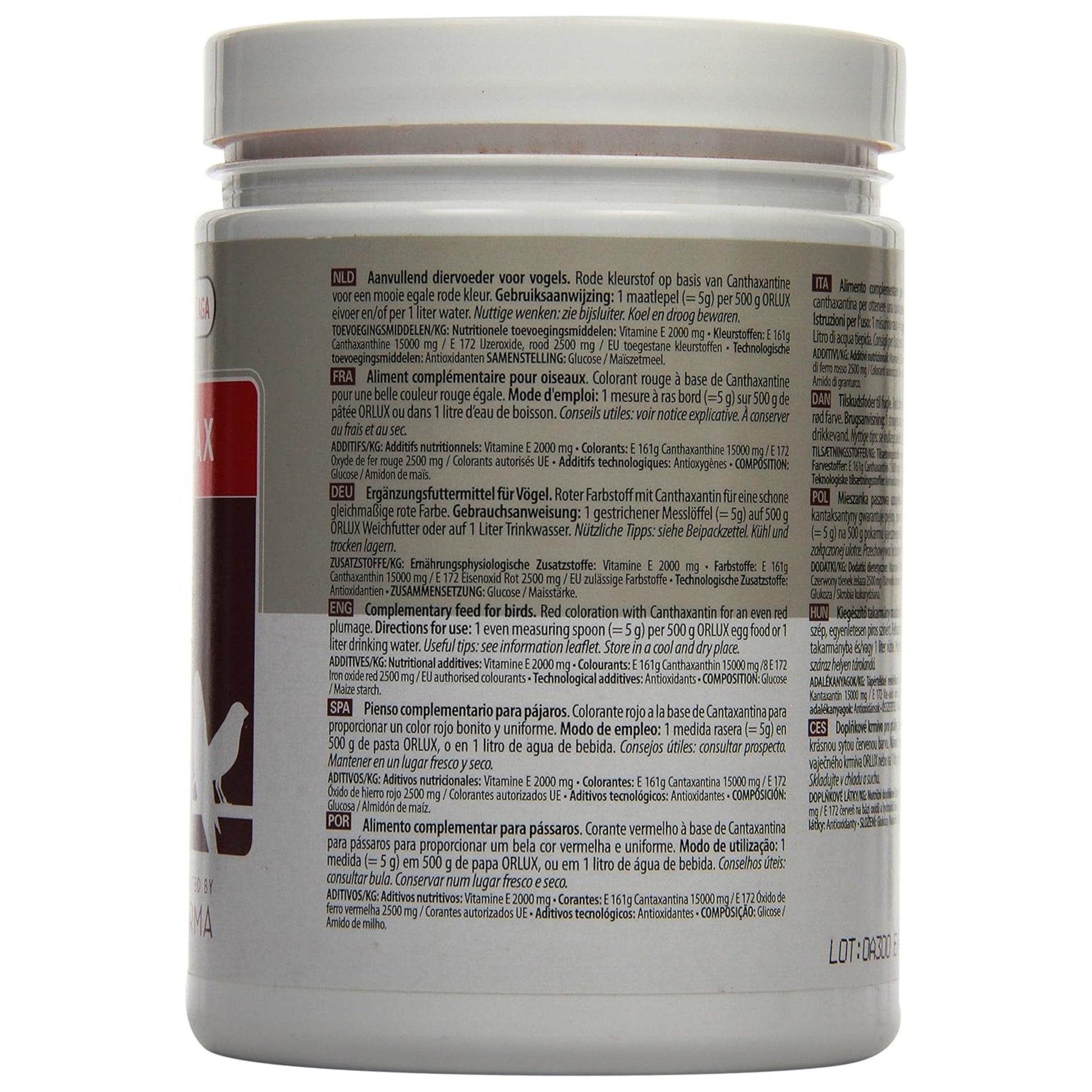 Versele-Laga Can-Tax es un colorante rojo para canarios.• Base de canthaxanthine• Intensifica el color rojo en otras aves• Asegura un color hermosoColorea canarios rojos, se intensifica el color rojo en otras aves y se asegura de un hermoso color rojo uniforme.Como plumas constan de células muertas y consecuentemente no son alimentados por el metabolismo, absorben el color cuando se forman. En promedio, el plumaje se cambia una vez al año, sin embargo, no de una sola vez. La muda de las plumas viejas es estimulada por la formación de nuevas y este es un proceso gradual de modo que el ave mantiene un plumaje completo. Cuando se añade Versele-Laga Can-Tax a los alimentos se transporta hasta el lugar donde la pluma está creciendo y se le da el color rojo más intenso. La pluma formada conserva su color hasta la formación de una pluma nueva.USO1 medida de nivel (= 1 g) por 100 g de comida o por 200 ml de agua potable. Durante la temporada de cría: 2 semanas antes de la puesta del primer huevo. Durante la muda: Todos los días durante todo el período. Para mostrar las aves: todos los días durante todo el año. La duplicación de la dosis en la recomienda durante la muda.COMPOSICIÓN:Canthaxanthine, Beta-apo-8'-carotenal, Vitamin E, E 124, Iron oxide, BHTFORMATO:- Bote de 500 gr