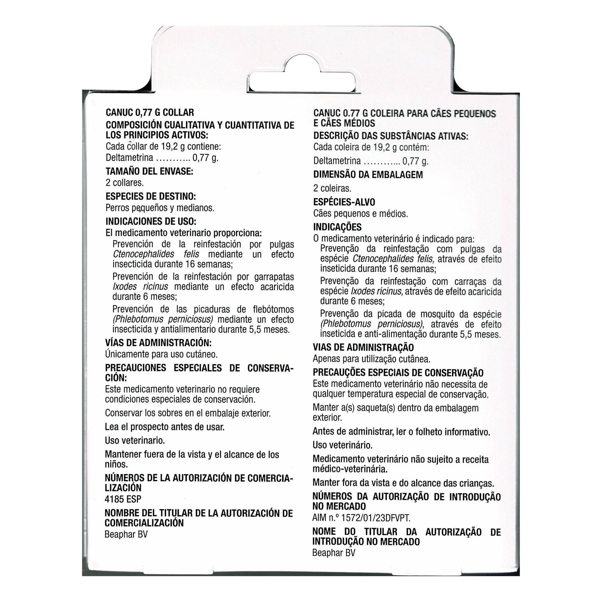 Collar Antiparasitario para Perros Pequeños y Medianos Canuc DeltametrinaEl Collar Canuc Deltametrina para Perros Pequeños y Medianos a partir de las 7 semanas de edad contiene deltametrina como sustancia activa. La deltametrina se libera despacio y de forma continua por el contacto del collar con el pelaje del perro. De esta forma, a través de la capa lipídica de la piel, crea una barrera protectora uniforme sobre todo el cuerpo del animal. Además, esta sustancia activa nunca entra en el torrente sanguíneo del perro. Por último, cuando las pulgas, garrapatas o flebótomos entran en contacto con la Deltametrina, se paralizan rápidamente y son eliminadas evitando la leishmaniosis, por ejemplo.Beneficios Collar Canuc Deltametrina para Perros Pequeños y Medianos:- Eficaz contra pulgas, garrapatas y mosquitos-flebotomos. Protección frente a la leishmaniosis.- La sustancia activa actúa sin entrar en el cuerpo del perro.- Liberación gradual de la sustancia activa- Inodoro y resistente al agua con contacto ocasional- Fácil de colocar gracias a su correa ajustable.- Apto para cachorros a partir de las 7 semanas de edad.Triple Protección de Larga Duración:- 5’5 meses contra MOSQUITOS-FLEBOTOMOS “LEISHMANIOSIS”- 6 meses contra GARRAPATAS- 16 semanas contra PULGASComposición:Composición: DeltametrinaPequeño: 0,77 g.Grande: 1,04 g.Envase collar 65 cm: 2 uds.Presentación:2 collares de 65 cm por caja de color negro que libera un polvillo blanquecino.