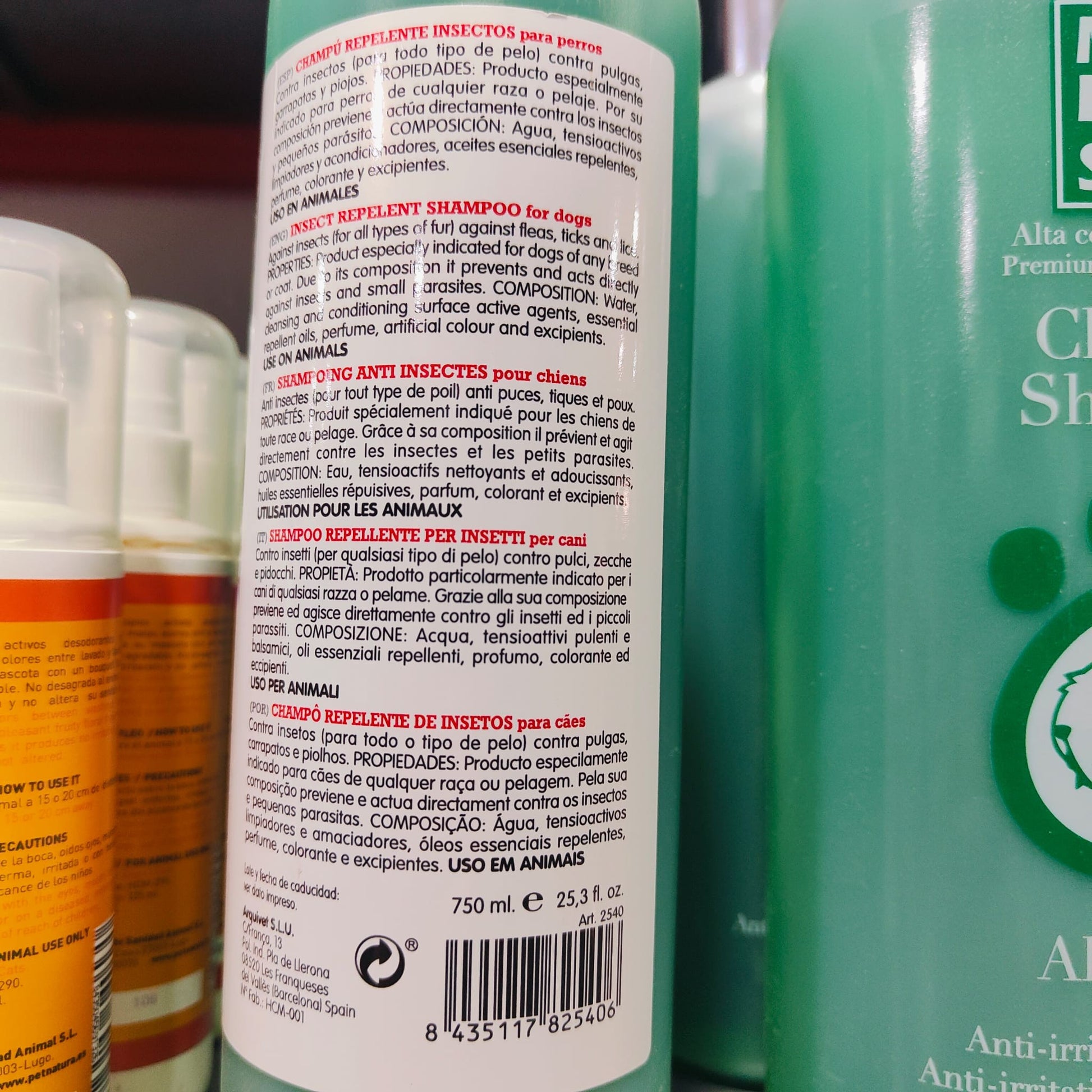 PROPIEDADES: Producto especialmente indicado para perros de cualquier raza o pelaje. Por su composición previene y actúa directamente contra los insectos y pequenos parásitos. COMPOSICIÓN: Agua, tensioactivos limpiadores y acondicionadores, aceites esenciales repelentes, perfume, colorante y excipientes. USO EN ANIMALES Capacidad: 750ml.