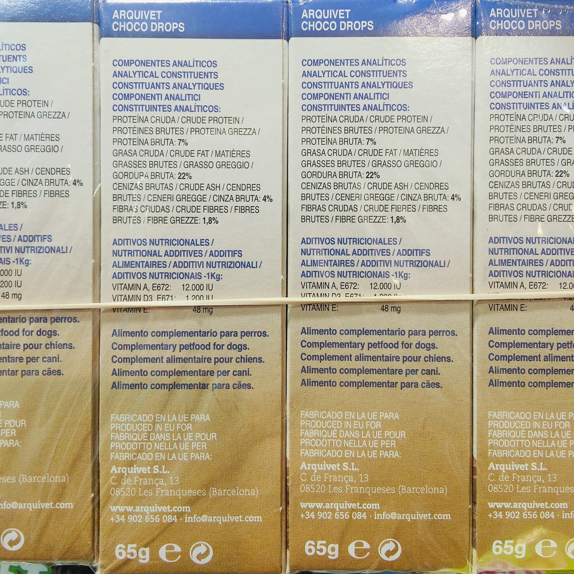 Choco Drops de Arquivet: el capricho irresistible para tu perro. Estos deliciosos premios están cargados de vitaminas que potencian su salud, brillo del pelaje y vitalidad. Perfectos para usar a diario como recompensa. Dosifica 3-10 drops según el tamaño de tu peludo y ajusta su comida habitual en consecuencia. Mantén agua fresca siempre disponible. Guarda en lugar fresco y seco. Presentación de 65 gramos.