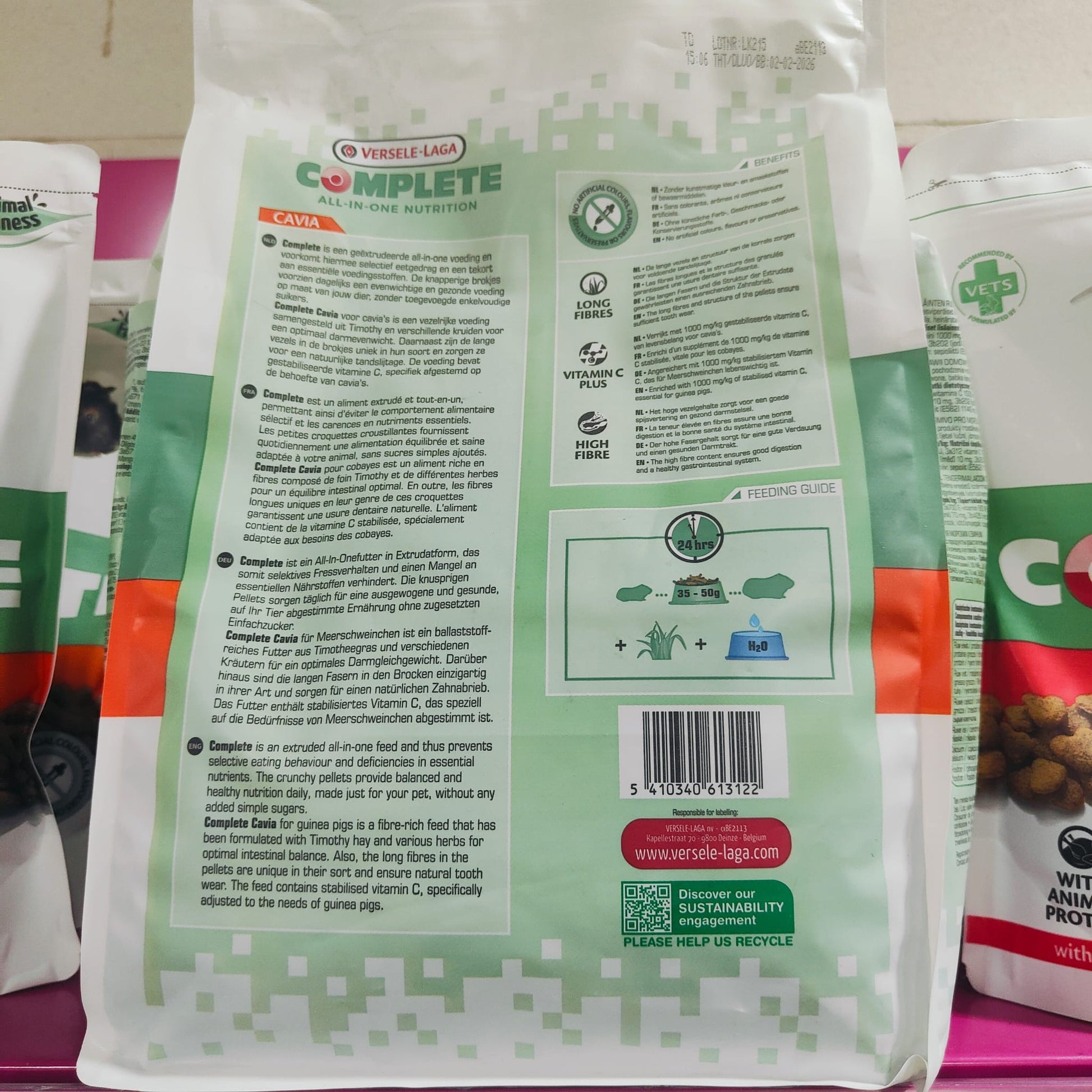 Alimento para cobayas completo y equilibrado Versele Laga Cavia CompleteEl pienso para cobayas Versele Laga Cavia Complete es un alimento sabroso y fácil de digerir que contiene hierbas y bayas de saúco, ideal para la alimentación diaria de estos simpáticos animales. Estas ricas croquetas extrusionadas aportan un extra de vitaminas, especialmente vitamina C, que junto a las fibras largas y el heno timoteo, favorece una salud dental óptima para tu mascota. Además, su tecnología all-in-one evita que desarrolle el mal hábito de la seleccionar los alimentos ya que con cada bocado tomará la cantidad adecuada de nutrientes que necesita para mantenerse saludable.Además de la vitamina C, esencial para las cobayas, este alimento para mascotas contiene otras que ayudan a mejorar la salud general y prevenir estados de carencia. Entre ellas está la vitamina A, que contribuye a la renovación de las células de la piel, la vista, la reproducción y el metabolismo. La vitamina D3 es buena para que el cuerpo absorba el calcio y el fósforo, ayudando a que los huesos estén más fuertes. Las vitaminas E y C son además antioxidantes que protegen de los radicales libres.La mezcla de ingredientes y los nutrientes que contiene la comida para cobayas Versele Laga Cavia Complete favorece la salud intestinal de tu mascota, gracias especialmente al Floratimul (una adición de prebióticos, fructo-oligosacáridos y manano-oligosacáridos) que ayuda a estimular la flora intestinal y previene problemas digestivos. Además, las fibras que contiene este alimento para cobayas evitan la formación de bolas de pelo y los extractos de yuca hacen que se reduzca el mal olor de sus deposiciones.Este excelente alimento para cobayas también te ayuda a controlar su peso porque es rico en fibra y bajo en calorías y almidón, y fortalece su sistema inmunitario gracias a los pigmentos vegetales naturales luteína y beta-caroteno, que benefician la resistencia y condición física generales, así como la formación de anticuerpos, y les da un pelo más lustroso y suave gracias a su exclusiva fórmula completa y enriquecida con ácidos grasos esenciales omega 3 y 6.VENTAJAS:Comida para cobayas muy equilibrada y sabrosa.Te ayuda a controlar el peso de tu mascota.Es muy fácil de digerir y cuida el aparato digestivo.Con extra de vitaminas que mejoran la salud general.Estimula el sistema inmunitario y favorece un pelaje sano y brillante.USO Y ESPECIFICACIONES:Comida para cobayas indicada como base de su alimentación diaria.Para que tu mascota tenga una vida sana y duradera debes procurar que su dieta sea variada y rica. Debes darle pienso y a ello unir heno, frutas y verduras frescas.Procura que tenga siempre comida y agua limpia y fresca.Conserva este producto en un lugar fresco y seco.Descripción nutricional:Ingredientes: subproductos de origen vegetal, cereales, verduras (min. 10%), extractos de proteínas vegetales, semillas, minerales, FOS, MOS, lecitina (0,2%), extracto de yuca y extracto de caléndula.Análisis garantizado: proteína bruta (15,5%), grasas brutas (3,5%), celulosa bruta (20%), ceniza bruta (8%), calcio (1,0%), fósforo (0,8%), vitamina A (10.000 UI/kg), vitamina D3 (1.500UI/kg), vitamina E (30 mg/kg), vitamina C (750 mg/kg), cobre-enxofre cúprico(II) (10 mg/kg).Tamaño/formato:Disponible en sacos de 500 gr, 1.75 kg,
