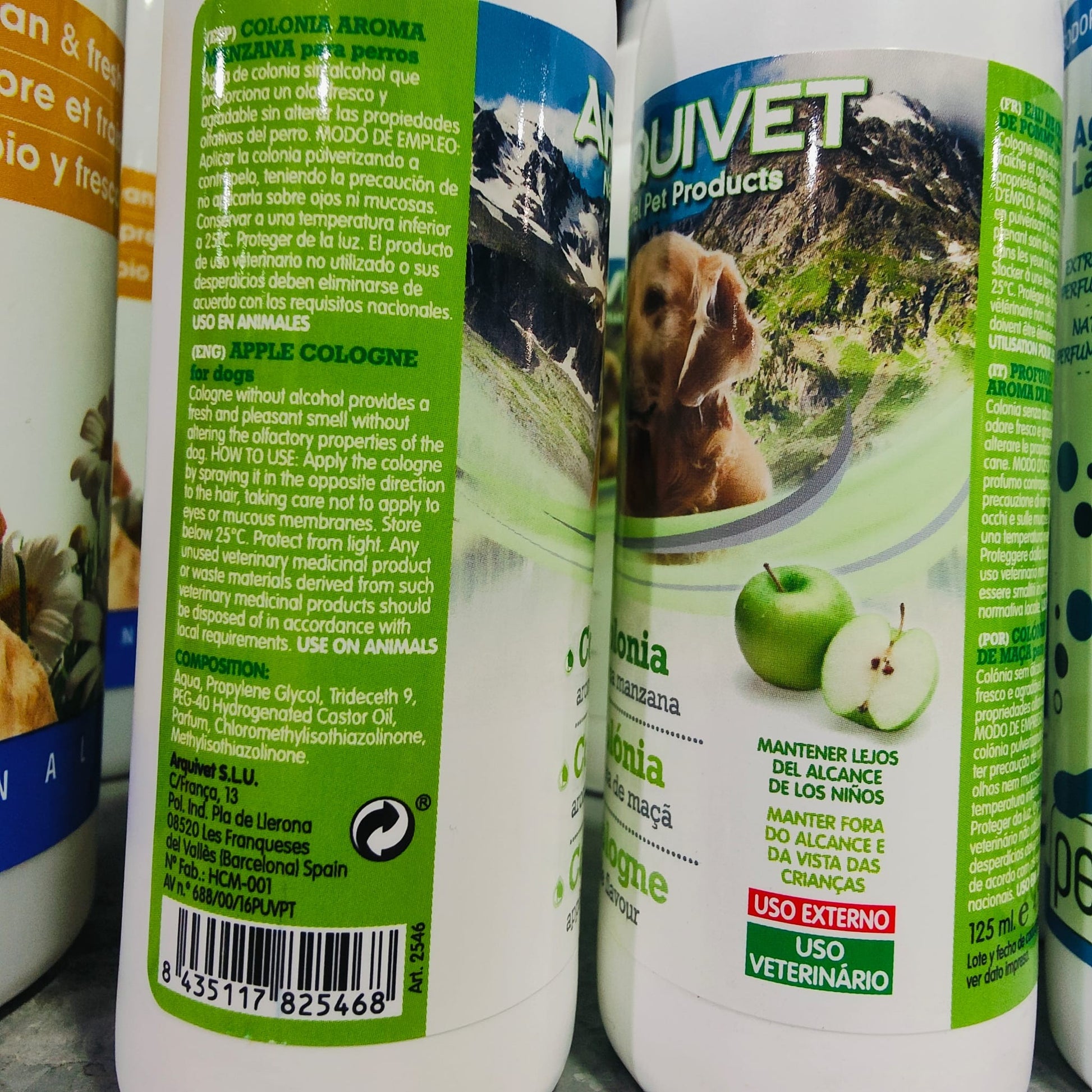 Colonia para perros manzana. Con extractos naturales. No altera las propiedades olfativas del perro.MODO DE EMPLEO: Aplicar la colonia pulverizando a contrapelo, teniendo la precaución de no aplicarla sobre ojos ni mucosas.COMPOSICIÓN: Agua, alcoholes, perfume y excipientes.*Uso en animales.