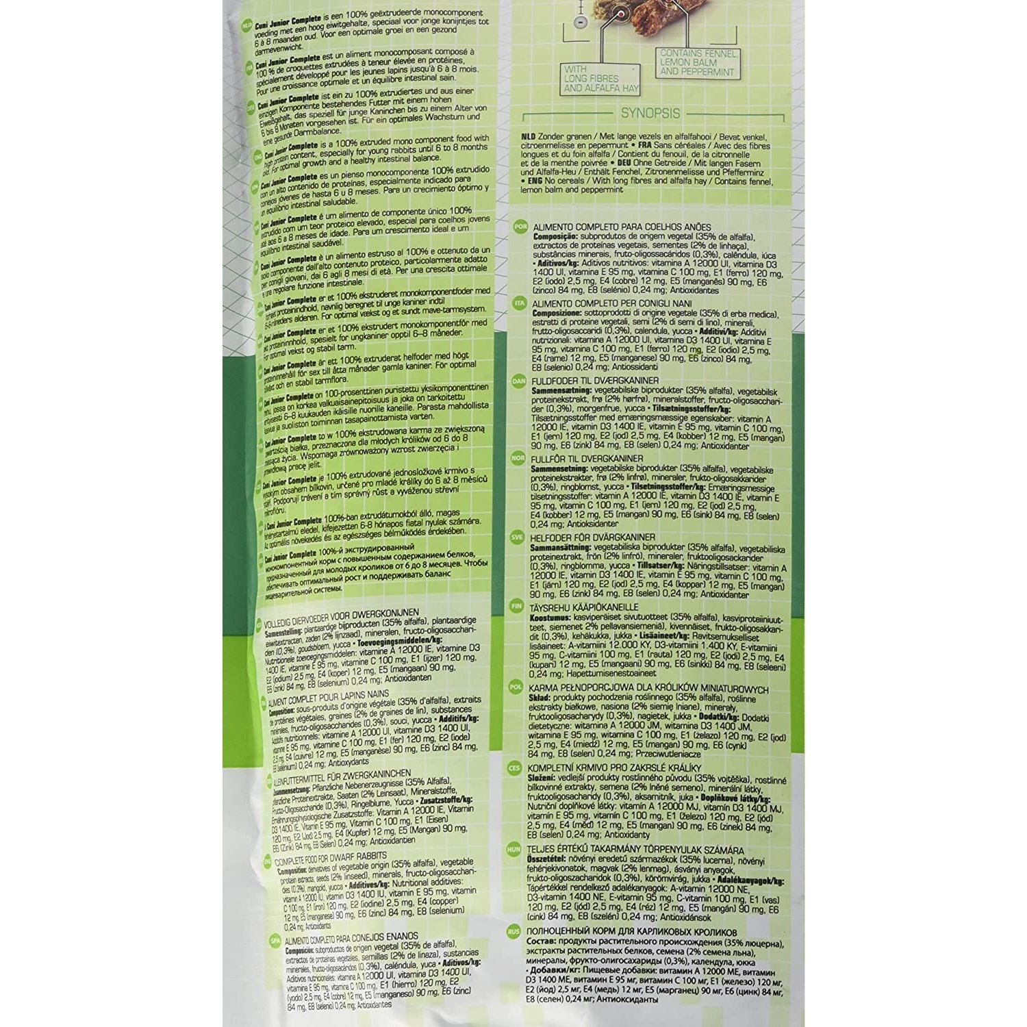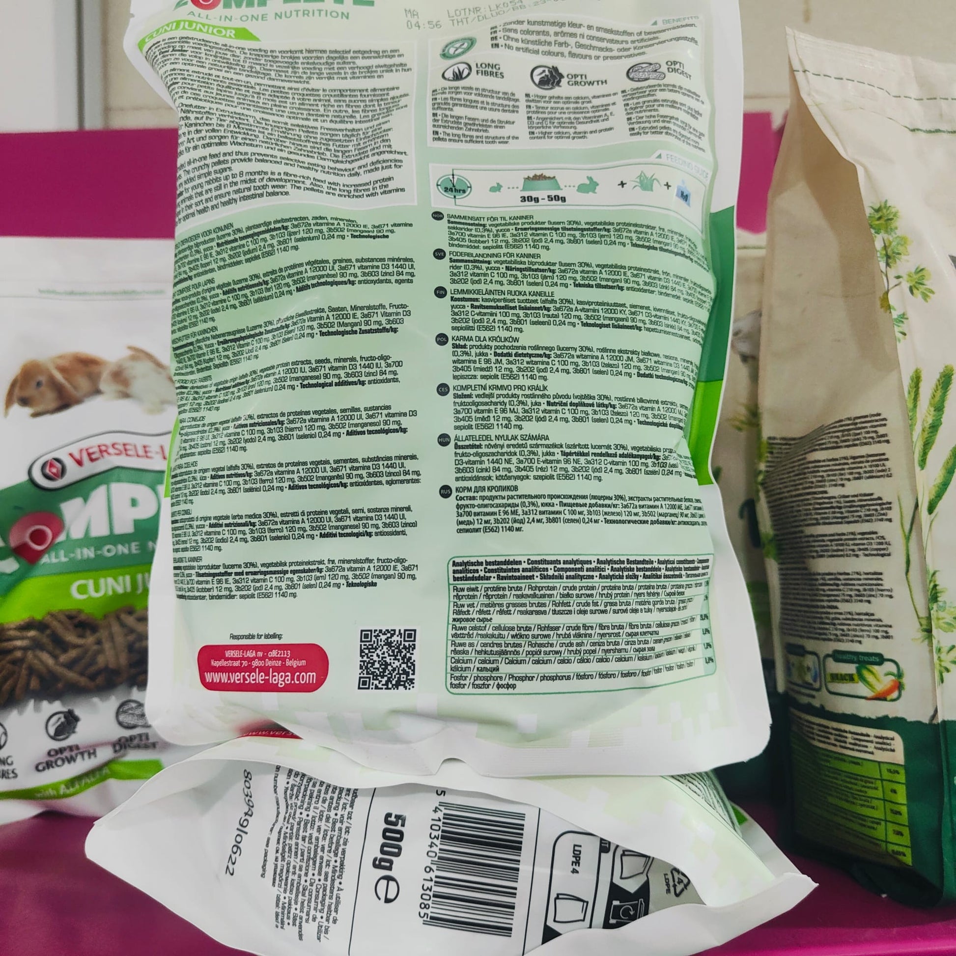 Pienso para conejos jóvenes Versele Laga Complete Cuni JuniorEl pienso para conejos jóvenes Versele Laga Complete Cuni Junior son unas deliciosas croquetas ricas en proteínas para la fase de crecimiento de los conejos, hasta los 6 u 8 meses de edad. Además de su alto contenido proteico, incluye un extra de fibras largas y heno alfalfa que favorecen el crecimiento, así como hierbas para una buena digestión y asimilación. Todo ello está elaborado con la tecnología All-in-one, que evita la mala costumbre de seleccionar los alimentos, habitual en estos animales, y es altamente atractivo para tu mascota, con lo que lo comen con apetito y deleite.Los productos de la gama Versele Laga Complete están enriquecidos con todos los nutrientes que necesita tu mascota para una salud óptima. Sus ingredientes aportan vitaminas, minerales y aminoácidos que favorecen un perfecto estado general y fortalecen el sistema inmunológico. Las fibras largas enteras con prebióticos estimulan su flora intestinal y la salud de sus dientes, ya que las sabrosas croquetas satisfacen el instinto de roer de estas mascotas. Todo ello se ve reflejado además en un pelaje suave y brillante al que contribuye el contenido equilibrado de ácidos grasos omega 3 y 6.VENTAJAS:Comida para conejos jóvenes en crecimiento muy completa y energética.Con tecnología All-in-one que evita la ingesta selectiva.Fácil de digerir, estimula la flora intestinal.Con extra de fibras largas y hierbas para un mejor crecimiento.Beneficia un sistema inmunitario más fuerte y un pelaje más suave y brillante.USO Y ESPECIFICACIONES:Comida para la cría de conejos jóvenes hasta los 6 u 8 meses de vida.Tu mascota debe tener siempre comida y agua limpia y fresca a su disposición.Conserva este producto en un lugar fresco y seco.Dosificación:Las raciones diarias en general entre los 50 y los 80 g.Tamaño/formato: 500 gramos.