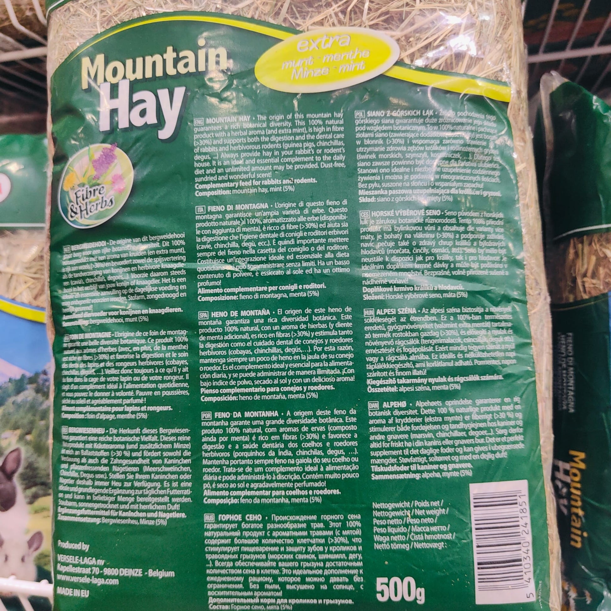 Mountain Hay - Heno de montaña con extra menta. Este producto 100 % natural, con un aroma de menta es rico en fibras (> 30 %) y estimula tanto la digestión como el cuidado dental de conejos y roedores herbívoros (cobayas, chinchillas, degús...). El origen de este heno de montaña garantiza una rica diversidad botánica.