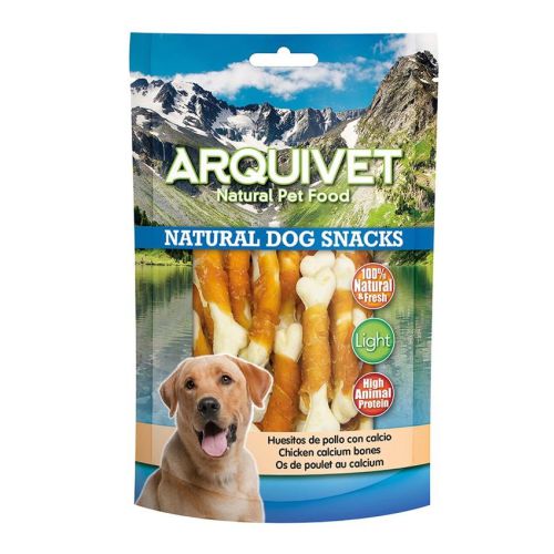 Snack en forma de huesitos con carne de pollo enrollada. 100% natural. Con un alto contenido en proteína animal y con pocas grasas (Producto Light). Alimento complementario para su perro, con aportación extra del calcio, muy rico en nutrientes.Utilizar como un regalo o recompensa en cualquier momento, dentro de una dieta equilibrada. El perro debe ser supervisado en todo momento mientras se alimenta. Mantener en lugar fresco y seco, así como no exponer directamente a la luz solar. Dejar siempre agua dulce y fresca a disposición de su mascota.COMPOSICIÓN: Carne de pollo 47%, Carbonato de calcio 45,4%, Proteínas vegetales 1,5%, Glicerina 3,2%, Sorbitol 2,5%, Sal 0,2%. COMPONENTES ANALÍTICOS: Proteína 20%, Aceites y grasas brutos 5%, Ceniza bruta 5%, Fibra bruta 1,2%, Humedad 18%