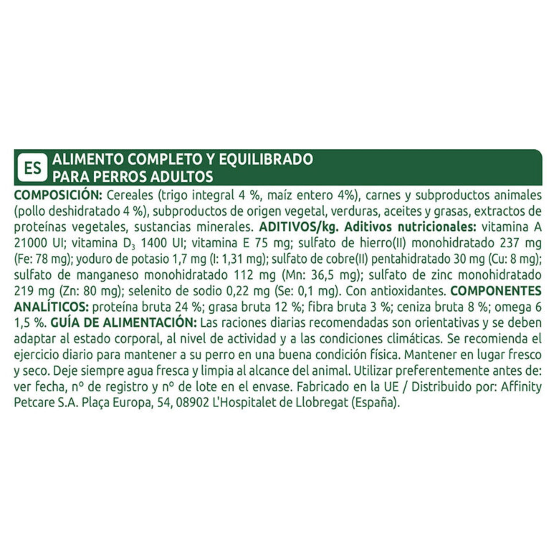 LIBRA Dog Adult de Pollo,es un pienso completo y equilibrado para perros adultos,es decir, para después de su primer año de vida y durante su edad adulta. LIBRA, una nueva marca exclusiva para establecimientos especializados, con toda la garantía del proceso de calidad de Affinity.BENEFICIOS- Gracias a los minerales y vitaminas (calcio, fósforo y vitamina D): dientes y huesos fuertes.- Con el aporte equilibrado de nutrientes, proteínas de alta calidad: Musculatura fuerte.- Los cereales integrales aportan una elevada digestibilidad y salud intestinalNGREDIENTESCereales (entre otros 4% trigo integral y 4% maíz), carnes y subproductos animales (6% pollo, 4% cerdo), subproductos de origen vegetal, aceites y grasas, sustancias minerales.