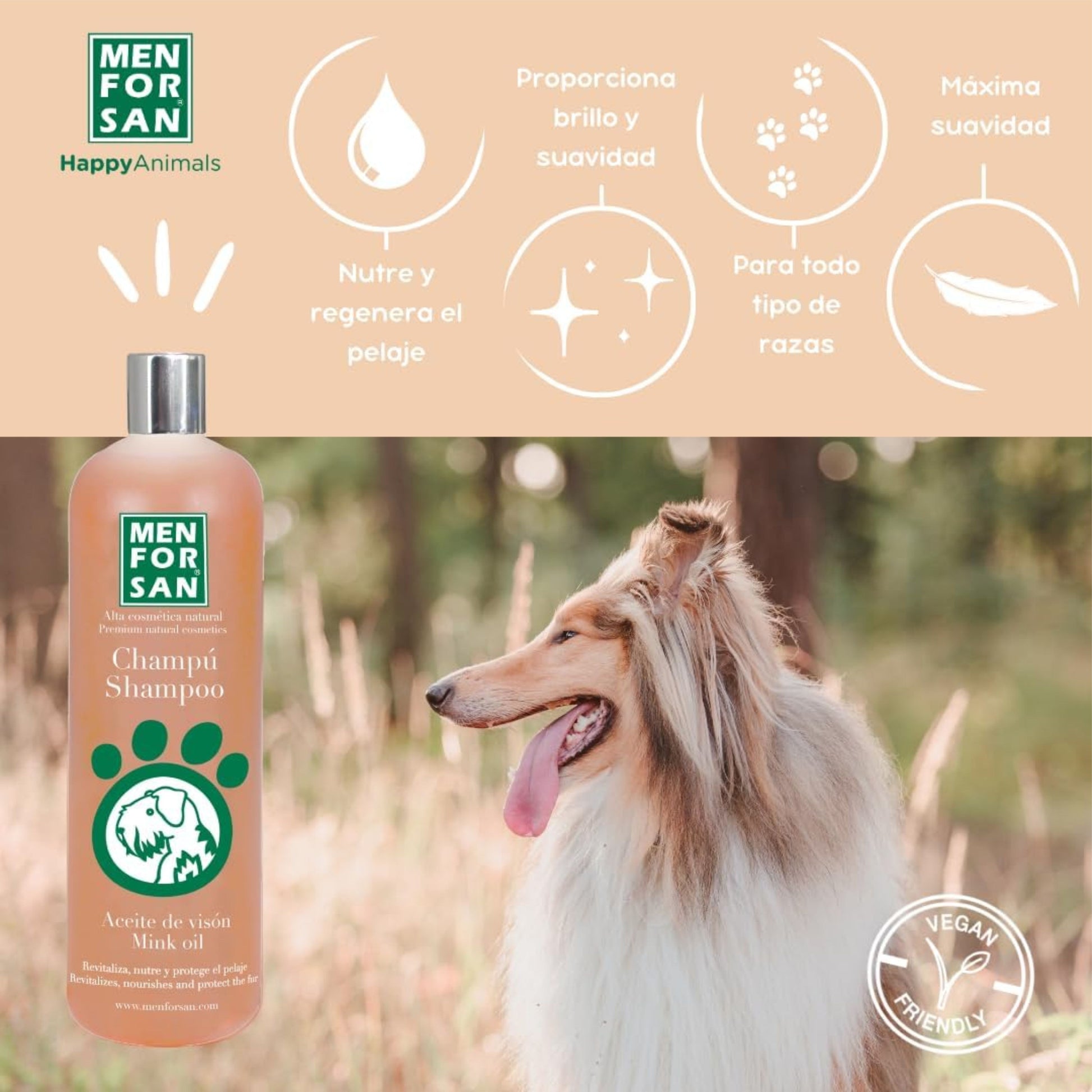 Champú de máxima calidad con aceite de visón que protege y nutre el pelaje. El ACEITE DE VISON aporta alta hidratación en pelajes secos. Evita o corrige el desequilibrio nutricional que origina el pelo seco, rígido, mate o demasiado fino, que se rompe o anuda. Tiene un alto poder penetrante y por su riqueza en acidos grasos esenciales fortalece las fibras queratinitas del pelaje restaurando su vitalidad flexibilidad y brillo. Ideal para un uso frecuente en razas de pelo largo como Yorkshires, Afgano, Maltés, Lhasa Apso y Setters. MODO DE EMPLEO:Humedecer el pelaje con abundante agua tibia. Aplicar el champú en cuello, lomo, manos y patas. Masajear hasta conseguir una abundante y cremosa espuma y dejar actuar unos instantes. Aclarar y dejar que el perro se sacuda. Secar con toalla y eliminar los restos de humedad con un secador mientras se cepilla el pelo. pH adaptado.