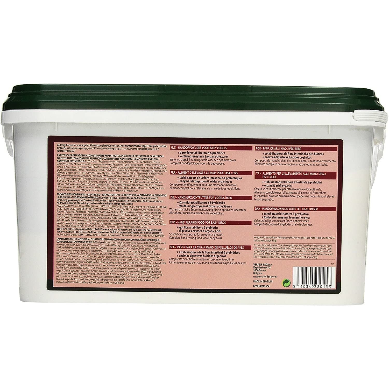 NutriBird A 21 es un alimento completo para la cría a mano de todos los pájaros bebé. Compuesto científicamente para un crecimiento óptimo.Modo de empleo: La pasta NutriBird A 21 para la cría a mano se prepara añadiendo agua hervida. Las proporciones de la mezcla dependen de la edad del polluelo y deben cumplirse a rajatabla. Utilice la tabla adjunta para preparar la pasta. Es recomendable medir cuidadosamente las cantidades en las primeras preparaciones.Mezcle en un recipiente pequeño las cantidades recomendadas en la tabla de la pasta de cría Nutribird A21 con agua caliente. Habida cuenta de las bacterias dañinas que puede contener el agua del grifo, es muy aconsejable hervir el agua antes o utilizar agua embotellada.Mezclar enérgicamente la pasta. Dejar reposar un minuto. Si se prepara adecuadamente, se acaba obteniendo una papilla espesa.Dejar enfriar la papilla resultante hasta 39ºC. Antes de administrarla, remover de nuevo bien para evitar que se separen el agua y la pasta.Atención: la papilla tiene que estar recién preparada para cada comida. Así pues, conviene preparar el alimento en pequeñas cantidades.EDADVOLUMENNutriBirdA 21AguaEclosión – día 21 porción6 porcionesDía 2 - día 31 porción5 porcionesDía 3 - día 41 porción4 porcionesDía 4 - día 51 porción3 porcionesDía 5 - destete1 porción2 - 2,5 porcionesComposición: Productos de panadería, Extractos de proteínas vegetales, Subproductos de origen vegetal, Aceites y grasas, Minerales, Vitaminas, Metionina, Lisina, Levadura, Oligoelementos, Probiótico (lactobacillus sp.) y Encimas.Componentes analíticosProteína (21 %)Contenido de grasa (8 %)Celulosa bruta (3 %)Ceniza bruta (6 %)Calcio (0,90 %)Fósforo (0,60 %)Sodio (0,20 %)Magnesio (0,17 %)Lisina (1,15 %)Metionina (0,53 %)Treonina (0,75 %)Triptófano (0,20 %)Aditivos nutricionales:Vitamina A (7.200 UI/kg)Vitamina D3 (1.500 UI/kg)Vitamina E (85 mg/kg)Vitamina K3 (3 mg/kg)Vitamina B1 (7,50 mg/kg)Vitamina B2 (16 mg/kg)Vitamina B3 (20 mg/kg)Vitamina B6 (6 mg/kg)Vitamina B12 (0,03 mg/kg)Vitamina C (60 mg/kg)Vitamina PP (80 mg/kg)Ácido fólico (1,50 mg/kg)Biotina (260 µg/kg)Cloruro de colina (605 mg/kg)E160a - ß-caroteno (4,35 mg/kg)E2-yodo (2 mg/kg)E4-cobre (10 mg/kg)E5-manganeso (100 mg/kg)E6-zinc (100 mg/kg)E8-selenio (0,20 mg/kg)Aditivos zootécnicosLactobacillus sp.