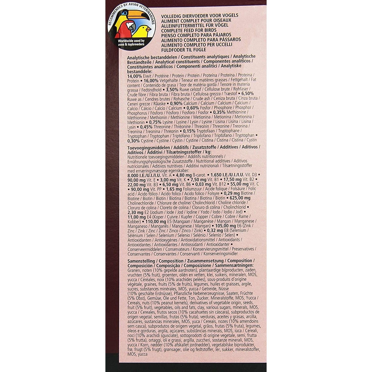 NutriBird G 14 Original es un pienso de mantenimiento completo y equilibrado para grandes periquitos. Son granulados con una composición científicamente probada a base de cereales seleccionados, fruta fresca y cacahuetes.Contiene Florastimul, una sustancia que estimula la flora intestinal y protege de los trastornos intestinales. Si su pájaro no está acostumbrado a los alimentos granulados, la transición a esta nueva alimentación deberá ser gradual. Composición:Cereales Semillas (mín. 10 % cacahuetes pelados) Fruta (mín. 5 % fruta fresca) Extractos de proteínas vegetales Subproductos de origen vegetal Azúcares Minerales L-Lisina Metionina Extr. Yucca schidigera Fructo-oligosacáridos Vitaminas Oligoelementos