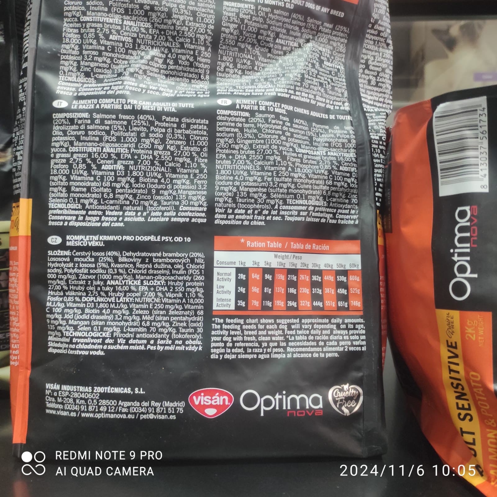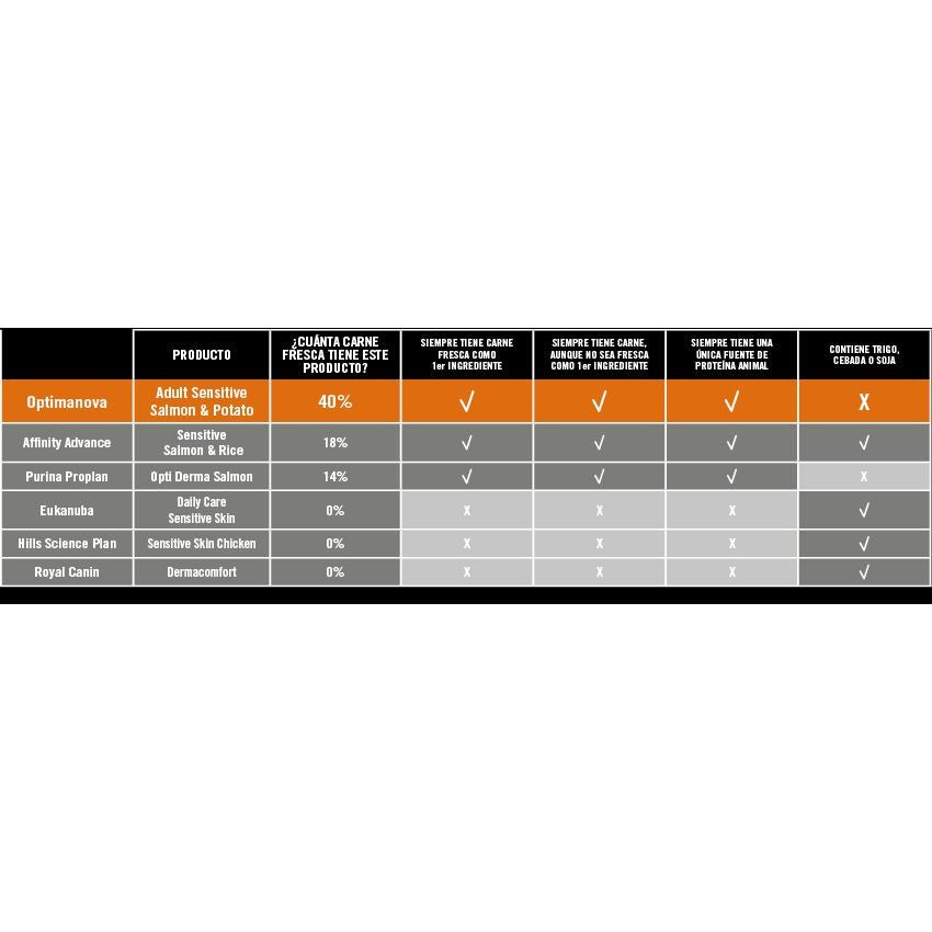 VISAN OPTIMA NOVA ADULT SENSITIVE (salmón y patata), es un alimento completo SIN CEREALES para perros adultos de cualquier raza.* Ideal para perros con pieles sensibles y/o estómagos delicados.INTESTINAL PROTECTION: La acción protectora de la L-glutamina sobre las células de la mucosa intestinal, unida a la acción estimulante de la producción de enzimas digestivas del jengibre facilitan de una manera extraordinaria la digestión de los nutrientes.IMMUNITY CONTROL PROGRAM: Sistema de protección anti-cancerígena, contribuye al desarrollo del sistema nervioso, fortaleciendo el sistema inmune y la salud cardiovascular.GASTRIC PROTECTION: La mezcla especial de los ingredientes provocan una digestión rápida con el mínimo desgaste en el estómago.DIGESTIVE HEALTH SYSTEM: El efecto prebiótico del FOS, estimula la flora bacteriana beneficiosa del sistema digestivo (efecto bífidus), Los MOS eliminan la flora perjudicial, logrando una mejor salud digestiva.SKIN & COAT: La presencia del Zinc ayuda a la regeneración de la piel, manteniéndola en un estado sano y vigoroso. Los ácidos grasos la fortaleceny consiguen un pelo fuerte y brillante.COMPOSICIÓN: Salmón fresco (40%), Harina de salmón (25%), Patata deshidratada (2O%), Proteína de patata, Hidrolizado de salmón (5%), Levadura, Pulpa de remolacha, Aceite, Cloruro sódico, Polifosfatos de sodio (0,3%), Cloruro potásico, Inulina (FOS 1.000 mg/Kg), Jengibre (1.000 mg/Kg), Manano-oligo-sacáridos (260 mg/Kg), Extracto de yucca.CONSTITUYENTES ANALÍTICOS: Proteína bruta 27,00 %, Aceites y grasas brutos 16,00 %, EPA + DHA 2.550 mg/kg, Fibras brutas 2,75 %, Ceniza bruta 7,00 %, Calcio 1,10 %, Fósforo 0,85 %.ADITIVOS: NUTRICIONALES: Vitamina A 18.000 UI/Kg. Vitamina D3 1.800 UI/Kg. Vitamina E 250 mg/Kg. Vitamina C 100 mg/Kg. Biotina 4,0 mg/Kg. Hierro (sulfato ferrosomonohidratado) 68mg/ Kg. Yodo (Yoduro potásico) 3,2 mg/Kg. Cobre (Sulfato cúprico pentahidratado) 9 mg/Kg. Manganeso (sulfato manganoso monohidratado) 6,8 mg/Kg.Zinc (oxido) 135 mg/Kg. Selenio (selenito sódico) 0,1mg/Kg. L-carnitina 70 mg/Kg. Taurina30 mg/Kg.TECNOLÓGICOS: Antioxidantes naturales (tocoferoles).Disponible en envases de 800 gr, 2 kg y 12 kg.