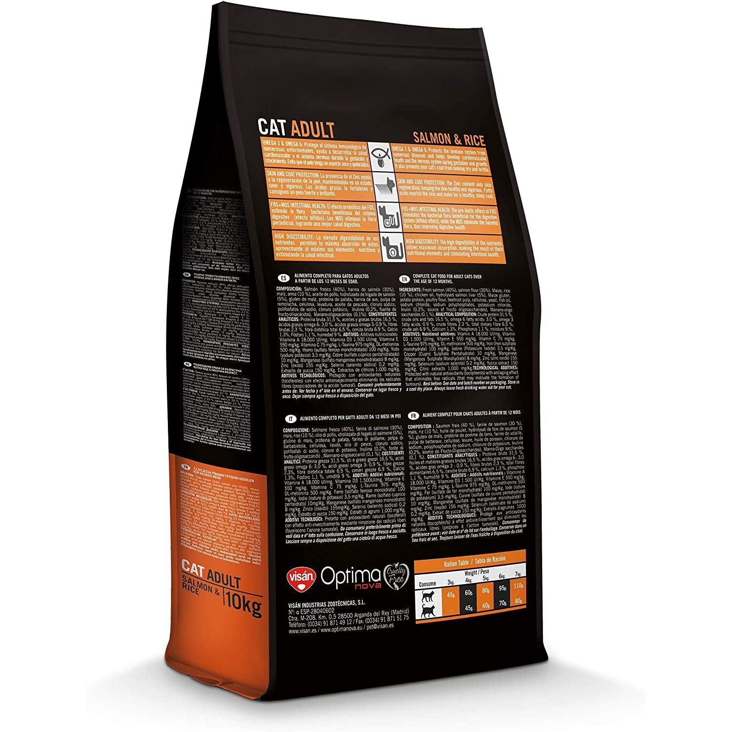 VISAN OPTIMA NOVA ADULT SALMON (salmón y arroz), es un alimento completo para gatos adultos a partir de los 12 meses de edad.OMEGA 3 Y OMEGA 6:Protege al sistema inmunológico de numerosas enfermedades, ayuda a desarrollar la salud cardiovascular y el sistema nervioso durante la gestación y crecimiento. Evita que el pelo tenga un aspecto seco y quebradizo.SKIN AND COAT PROTECTION:La presencia de el Zinc ayuda a la regeneración de la piel, manteniéndola en un estado sano y vigoroso. Los ácidos grasos la fortalecen y consiguen un pelo fuerte y brillante.FOS+MOS INTESTINAL HEALTH:El efecto prebiótico del FOS, estimula la flora bacteriana beneficiosa del sistema digestivo (efecto bífidus). Los MOS eliminan la flora perjudicial, logrando una mejor salud digestiva.RICH DISGESTIBILITY:La elevada digestibilidad de los nutrientes permiten la máxima absorción de éstos, aprovechando al máximo sus elementos nutritivos y estimulando la salud intestinal.COMPOSICIÓN:Salmón fresco (40%), harina de salmón (30%), arroz (10%), maiz, aceite de pollo, hidrolizado de higado de salmón (5%), glutén de maiz, proteina de patata, harina de ave,, pulpa de remolacha, celulosa, levadura, aceite de pescado, cloruro sódico, polifosfatos de sodio, cloruro potásico, Inulina (0.2%, fuente de fructo-oligosacáricos, Manano-oligosacáridos (0.1%).CONSTITUYENTES ANALÍTICOS:Proteína bruta 31,5%, aceites y grasas brutas 16,5%, ácidos grasos omega 6 3,0% ácidos grasos omega 3 0,90%, fibra bruta 2,3%, fibra dietética total 6,5%, ceniza bruta 6,9%, Calcio 1,3%, Fósforo 1,1%, humedad 9,0%.ADITIVOS:Aditivos Nutricionales:Vitamina A 18.000 UI7mg, Vitamina D3 1.500 UI / mg, Vitamina E 550 mg/kg, Vitamina C 75 mg, L-Tautina 975 mg/kg, DL-metionina 500 mg/kg, L-threonina 500 mg/kg, Hierro (sulfato ferroso monohidratado) 100 mg/kg, Yodo (yoduro potásico) 3,5 mg/kg, Cobre (sulfato cúprico pentahidratado) 10 mg/kg, Manganeso (sulfato manganoso monohidratado) 8 mg/kg, Zinc (óxido de zinc) 155 mg/kg, Selenio (selenito sódico) 0,2 mg/kg, Extractos de yucca 150 mg/kg, Extractos de cítricos (ricos en bioflavonoides) 1.000 mg/kg.Aditivos Tecnológicos:Protegido con antioxidantes naturales (tocoferoles) con efecto antienvejecimiento eliminando los radicales libres (propiciadores de la acción tumoral).Disponible en envases de 400 gr, 2 kg y 8 kg.