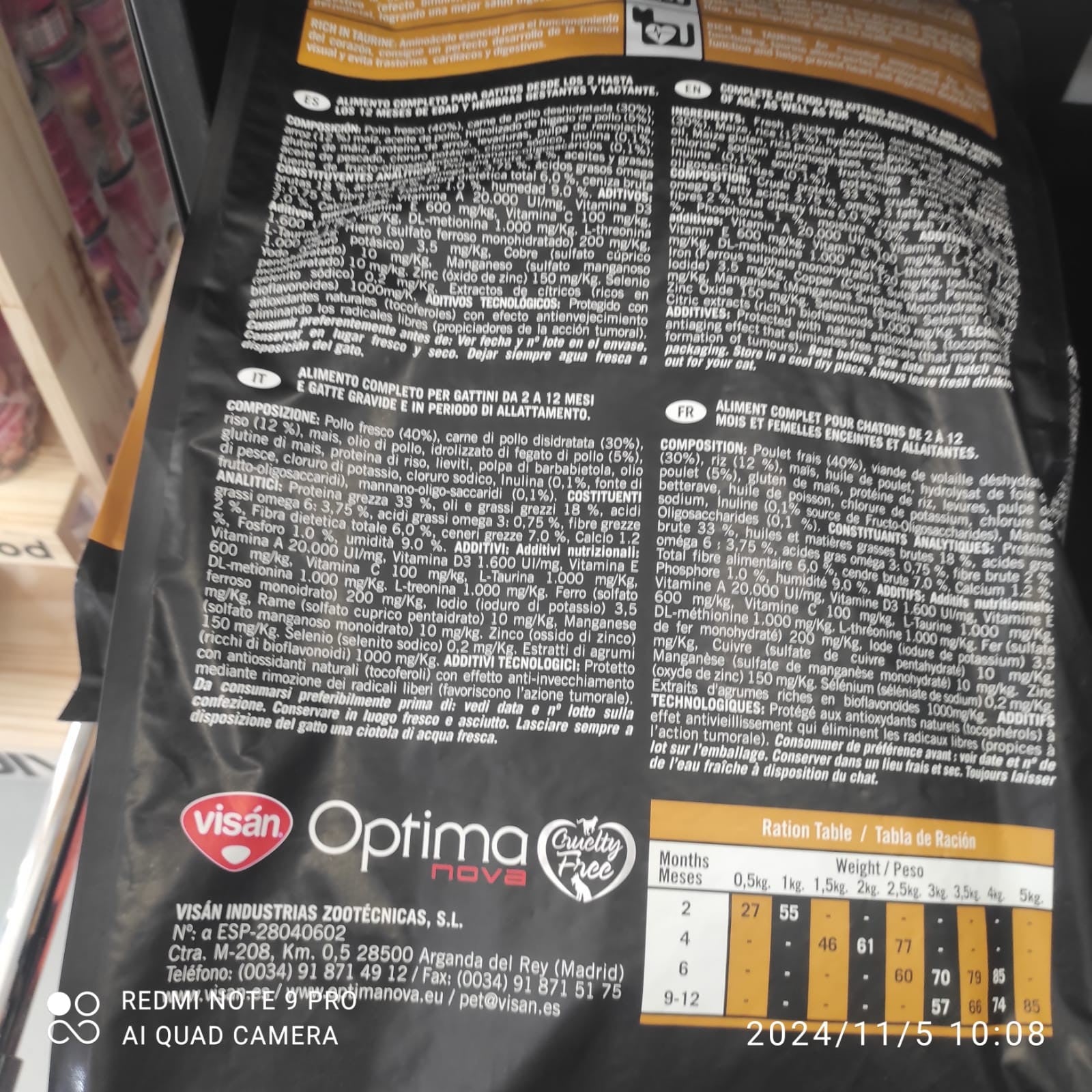 VISAN OPTIMA NOVA KITTEN (pollo y arroz), es un alimento completo para gatitos desde 2 hasta los 12 meses de edad y hembras gestantes y lactantes.OMEGA 3 Y OMEGA 6:Protege al sistema inmunológico de numerosas enfermedades, ayuda a desarrollar la salud cardiovascular y el sistema nervioso durante la gestación y crecimiento. Evita que el pelo tenga un aspecto seco y quebradizo.SKIN AND COAT PROTECTION:La presencia de el Zinc ayuda a la regeneración de la piel, manteniéndola en un estado sano y vigoroso. Los ácidos grasos la fortalecen y consiguen un pelo fuerte y brillante.FOS+MOS INTESTINAL HEALTH:El efecto prebiótico del FOS, estimula la flora bacteriana beneficiosa del sistema digestivo (efecto bífidus). Los MOS eliminan la flora perjudicial, logrando una mejor salud digestiva.RICH IN TAURINE:Aminoácido esencial para el funcionamiento del corazón, consigue un perfecto desarrollo de la función visual y evita trastornos cardíacos y digestivos.COMPOSICIÓN:Pollo fresco (40%), carne de pollo deshidratada (30%), arroz (12%), maiz, aceite de pollo, hidrolizado de higado de pollo (5%), glutén de maiz, proteina de arroz, levaduras, pulpa de remolacha, aceite de pescado, cloruro sódico, Inulina (0.1%, fructo-oligosacáricos, Manano-oligosacáridos (0.1%).CONSTITUYENTES ANALÍTICOS:Proteína bruta 33%, aceites y grasas brutas 18%, ácidos grasos omega 6 3,75% ácidos grasos omega 3 0,75%, fibra bruta 2%, fibra dietética total 6,0%, ceniza bruta 7,0%, Calcio 1,2%, Fósforo 1%, humedad 9,0%,.ADITIVOS:Aditivos Nutricionales:Vitamina A 20.000 UI7mg, Vitamina D3 1.600 UI / mg, Vitamina E 600 mg/kg, Vitamina C 100 mg, L-Tautina 1.000 mg/kg, DL-metionina 1.000 mg/kg, L-threonina 1.000 mg/kg, Hierro (sulfato ferroso monohidratado) 200 mg/kg, Yodo (yoduro potásico) 3,5 mg/kg, Cobre (sulfato cúprico pentahidratado) 10 mg/kg, Manganeso (sulfato manganoso monohidratado) 10 mg/kg, Zinc (óxido de zinc) 150 mg/kg, Selenio (selenito sódico) 0.2 mg/kg, Extractos de cítricos (ricos en bioflavonoides) 1000 mg/kg.Aditivos Tecnológicos:Protegido con antioxidantes naturales (tocoferoles) con efecto antienvejecimiento eliminando los radicales libres (propiciadores de la acción tumoral).Disponible en envases de 400 gr, 2 kg y 8 kg.