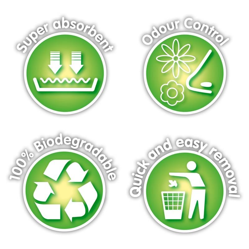 Su capacidad de absorción de liquidos y olores es superior a la de la arcilla y otros productos, lo que hace que no se necesite un cambio tan frecuente del absorbente, y así mejorar el control de olores y la higiene en general.Para gatos, pájaros y roedores. Superabsorbente e inodoro. Hecho a partir de papel reciclado libre de tinta. 100% biodegradable. Superabsorvente e inodoro, fabricado a partir de papel reciclado libre de tinta.