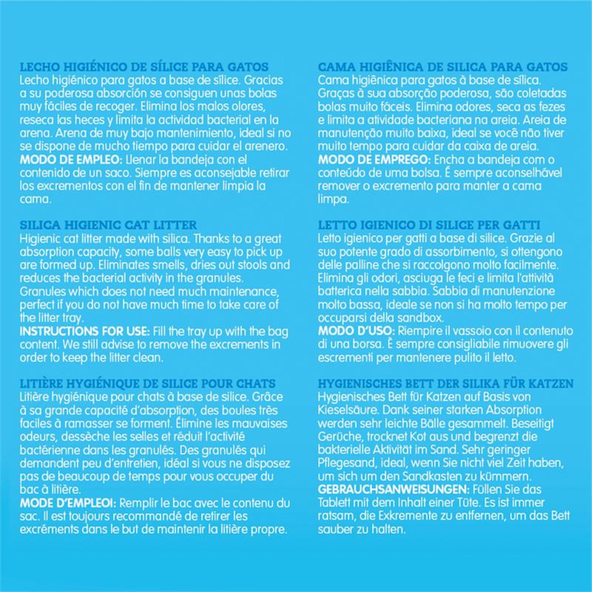 Lecho higiénico para gatos a base de arena de sílice. Tiene una gran capacidad absorbente, absorbiendo los malos olores y ayuda a eliminar las bacterias.Llenar la bandeja con el contenido de un saco. Periódicamente es aconsejable retirar los excrementos con el fin de mantener limpia la cama. Gracias a su biodegrabilidad, los residuos de la arena usada se pueden tirar al contenedor de los residuos biodegradables. Capacidad 7,6 litros