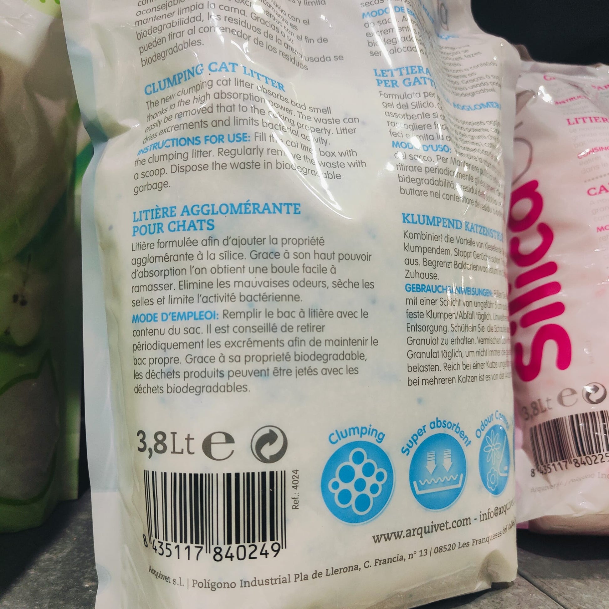 Arena aglomerante de sílice crystal para gatos que absorbe y forma bolas fáciles de recoger. Elimina olores, reseca heces y controla bacterias. Biodegradable y ecológica. Presentación de 3,8 litros (1,5 kg) con duración aproximada de 30 días.