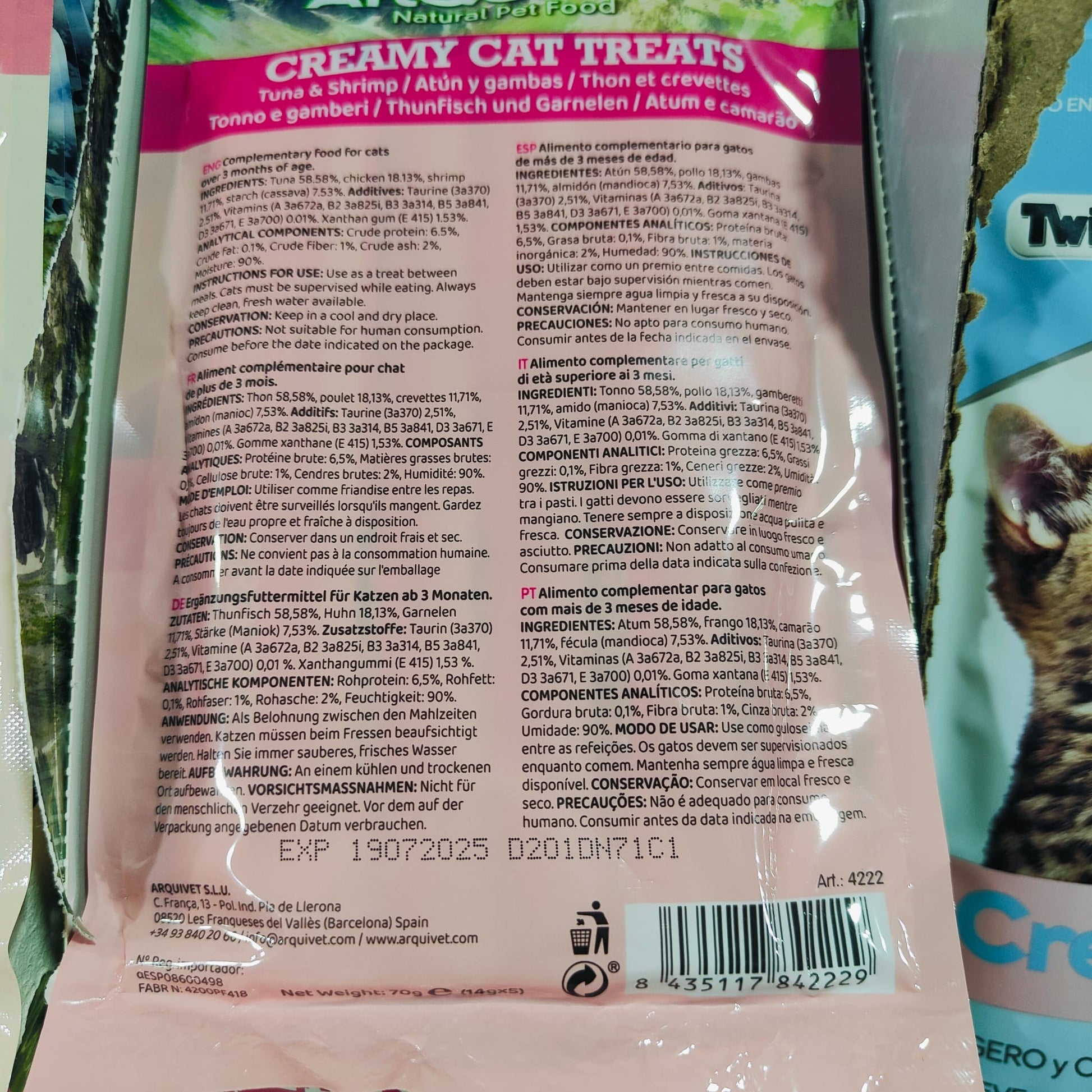 Snack líquido para gatos a base de atún y gambas. De fácil absorción, ayudan a tener una digestión saludable. Sin cereales, sin gluten. Sin colorantes, conservantes ni azucar añadido. Un premio exquisito que nuestros gatos lameran con deleite.Alimento complementario para gatos de más de 3 meses de edad. INGREDIENTES: Atún 58,58%, pollo 18,13%, gambas 11,71%, almidón (mandioca) 7,53%. Aditivos: Taurina (3a370) 2,51%, Vitaminas (A 3a672a, B2 3a825i, B3 3a314, B5 3a841, D3 3a671, E 3a700) 0,01%. Goma xantana (E 415) 1,53%.COMPONENTES ANALÍTICOS: Proteína bruta: 6,5%, Grasa bruta: 0,1%, Fibra bruta: 1%, materia inorgánica: 2%, Humedad: 90%.INSTRUCCIONES DE USO: Utilizar como un premio entre comidas. Los gatos deben estar bajo supervisión mientras comen. Mantenga siempre agua limpia y fresca a su disposición.CONSERVACIÓN: Mantener en lugar fresco y seco.PRECAUCIONES: No apto para consumo humano.
