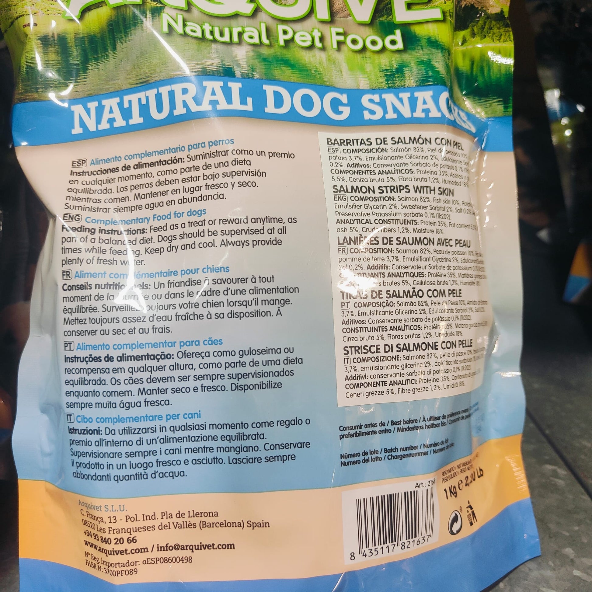 Snack Arquivet Barritas de Salmón 1kg Snack Barritas de salmón deliciosos, ideal para perros de todas las razas y tamaños.Sabroso snack totalmente natural, con un alto nivel de proteína.Snack light, es perfecto para aquellos perros que siguen una dieta reducida en grasas, o simplemente para mantener un peso ideal y equilibrado en nuestras mascotas. El formato de 1kg proporciona muchas barritas en cantidad, perfectas para satisfacer a tu mascota durante un largo periodo de tiempo.Contiene un cierre hermético para un mejor mantenimiento del alimento.Arquivet ofrece una gran variedad de snacks naturales y sabrosos para recompensar a tu mejor amigo peludo. ¿Quieres tener una gran reserva de snacks para tu mascota?Los sacos de 1kg de snack de arquivet te ofrece la posibilidad de ofrecerle a tu mascota todos los días snacks naturales y sabrosos cada vez que precise ser recompensado por su buen comportamiento. Sus CaracterísticasIngrediente principal salmónBolsa grande para un largo periodo.Bajo en grasas.100% NaturalSnack lightAlta proteína animal. El formato disponible de la bolsa es de 1kg. Modo de usoSuministrar como un premio en cualquier momento, como parte de una dieta equilibrada.Los perros deben estar bajo supervisión mientras comen.Mantener en lugar fresco y seco y cerrado con el cierre hermético que trae la bolsa.Suministrar siempre agua en abundancia. Arquivet natural dog snacks barritas de Salmón sabrosos e irresistibles, perfectos para tu mascota. Ingredientes Ingredientes PrincipalesSalmón 82 %, piel de pescado 10 %, almidón de patata 3.7 %, glicerina 2 %, sorbitol 2 %, sal 0,2% y sorbato de potasio. Analítica Proteínas 35 % Grasas 5.5 % Fibras 1.2 % Cenizas 5 % Humedad 18 %