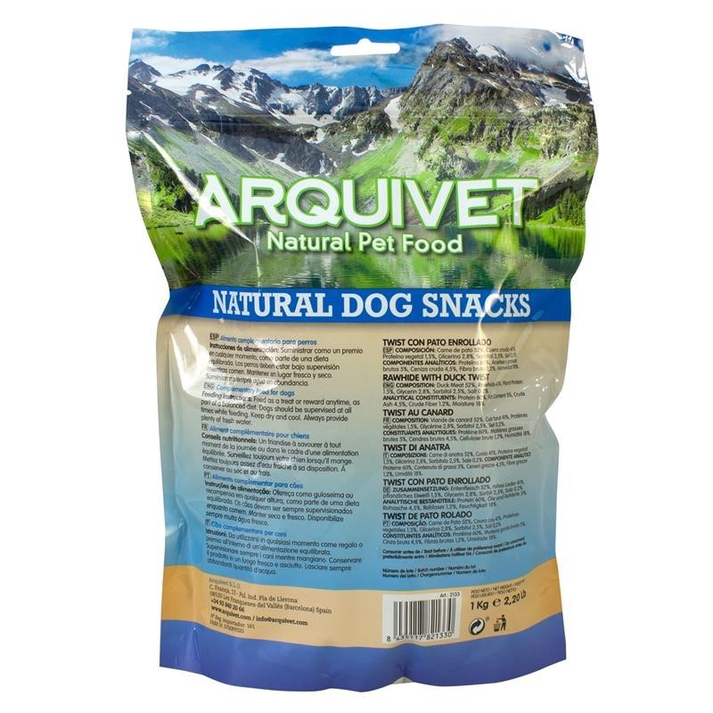 Arquivet Twist con Pato Enrollado es un idóneo snack para suministrar como premio en cualquier momento, dentro de la dieta equilibrada de tu perro. Disponible en envase de 1 Kg. Su medida es 13 cm.Este alimento complementario ha sido elaborado a base de filete de pato enrollado en un canuto, el cual le encantará a tu mascota, se mantendrá entretenido por muchas horas y es muy beneficioso para el cuidado de sus dientes y encías.El Twist con Pato Enrollado de Arquivet es 100% natural, rico en nutrientes, contiene un alto nivel de proteína animal y tiene poca grasa, por lo que es considerado un producto light. Te recomendamos mantener este bocadillos en un lugar fresco y seco.VENTAJAS:100% natural.Cuida de los dientes y encías del perro.Tiene un alto contenido en proteína animal y poca grasa. USOS Y ESPECIFICACIONES:Snack de filete de pato enrollado en canuto para premiar o recompensar a perros.Arquivet - Alimentación Natural Recompensas y premios Snacks y HuesosInformación técnicaComposición:Carne de pato 52%, Cuero crudo 41%, Proteinas vegetales 1,5%, Glicerina 2,8%, Sorbitol 2,5%, Sal 0,2%.Componentes Analíticos:Proteína 60%, Aceites y grasas brutos: 5%, Ceniza bruta 4,5%, Fibra bruta 1,2%, Humedad 18%.