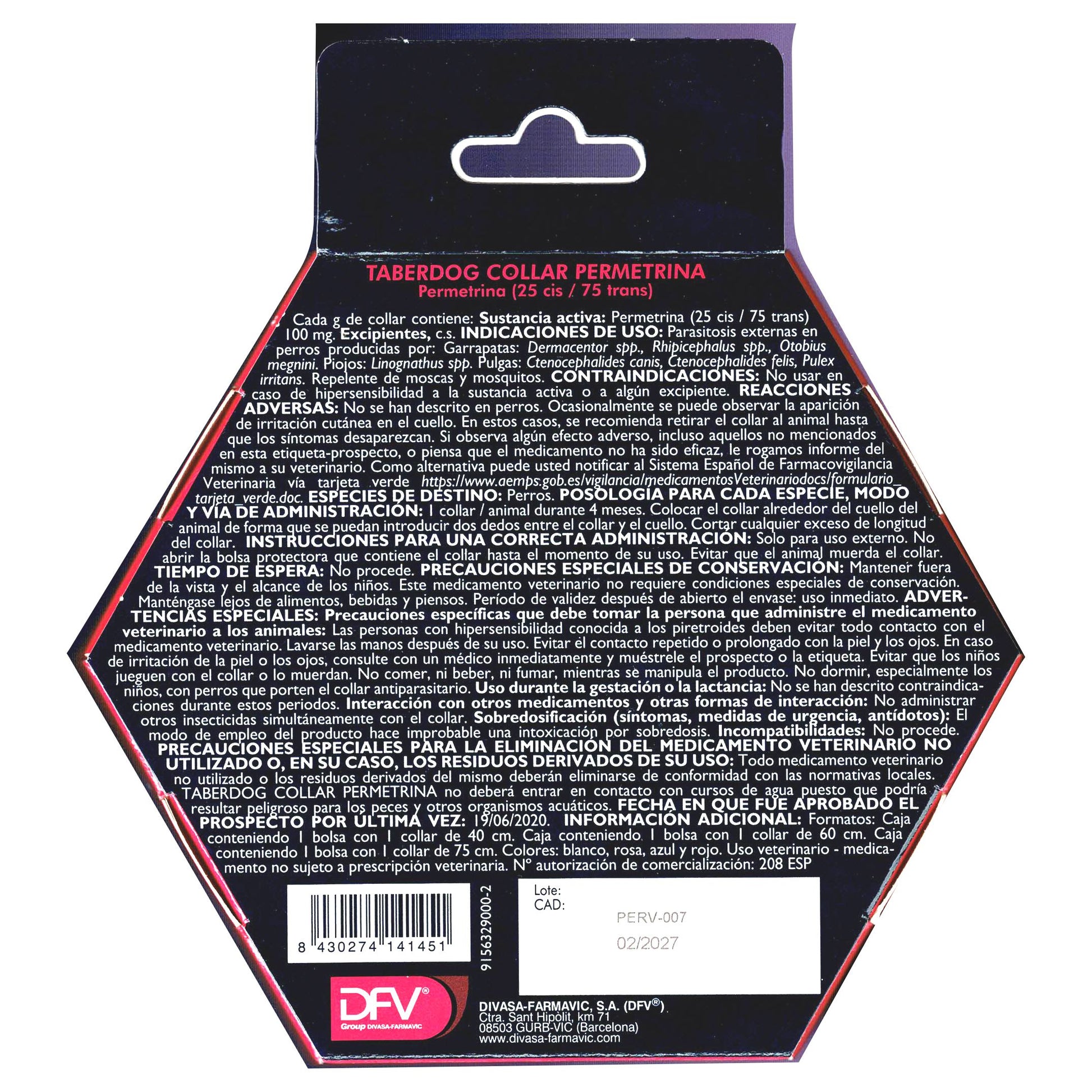 Collar antiparasitario para perros que, repele flebotomos (mosquito transmisor de la leishmania) y elimina pulgas, garrapatas y piojos. Su protección dura hasta 4 meses.Especie de destino: Perros de más de 2 meses de edad. Es el único collar apto para cachorros.Propiedades: La permetrina es un piretroide sintético de segunda generación que actúa provocando excitación, convulsión, parálisis y muerte de los insectos.Indicaciones: Parasitosis externa en perros producidas por pulgas: Ctenocephalidaes, canis, ctenocephalidas felis y pulex irritans, Garrapatas: Dermacetor spp, Otobius megnini y Rhipicephalus spp, Piojos: Linognathus spp y repelente de mosquitos (flebotomos)