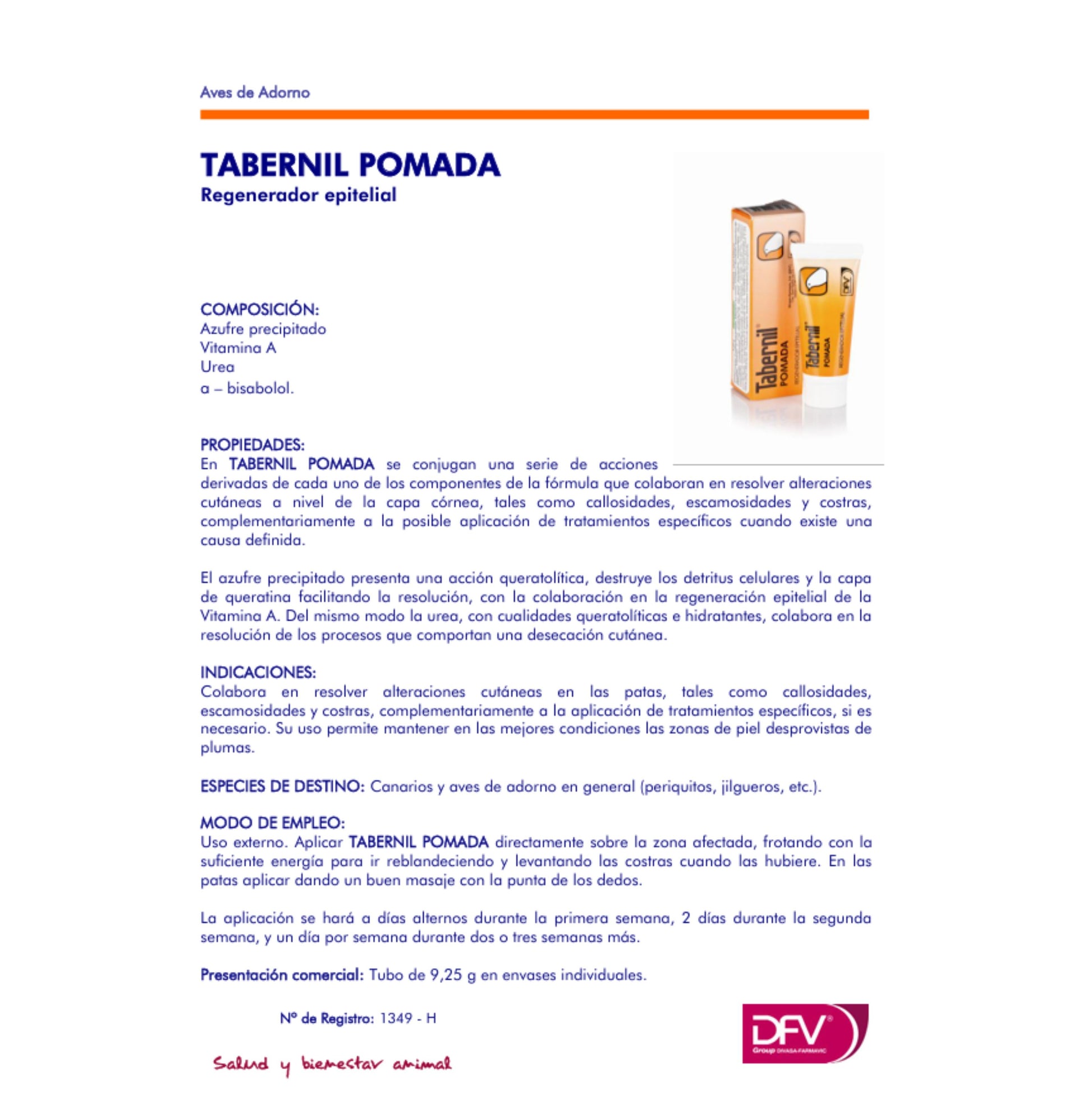 Tabernil Pomada esta indicada para todo tipo de aves, con excesivo crecimiento de piel en patas y pico, costas, descamaciones y callosidades. Esta pomada, mantiene la piel en las mejores condiciones y ayuda a los tratamientos antibacterianos a recuperar en menor tiempo su integridad. Mejora de forma sustancial la recuperacion de cualquier altración cutanea en zonas desprovistas de plumas, tales como heridas, callosidades, hiperqueratosis, costras de viruela,etc. Es un producto untuoso, por eso no debe ser usado en zonas con plumas.Disponible en envases de 9.25 gr.