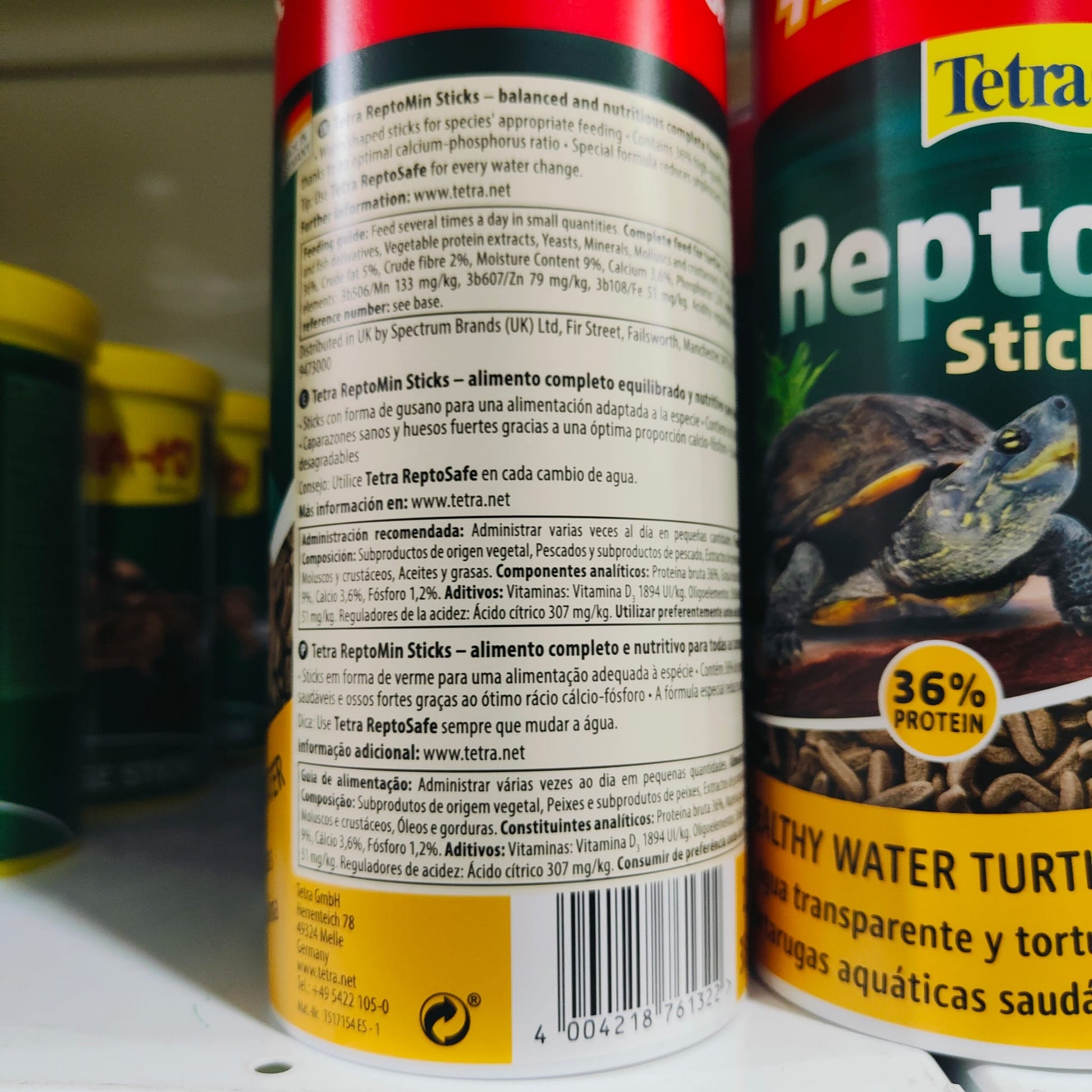 TetraReptomin, es un alimento completo y equilibrado para tortugas acuáticas.Se presenta en sticks, constituye el alimento primcipal para las tortugas. Este alimento no debe de faltar en la dieta de cualquier tortuga acuática, ya que contiene todos los nutrientes necesarios una correcta alimentación.CARACTERÍSTICAS:Para una alimentación sana y variada para tortugas.Contiene todos los componentes de primera necesidad.Óptimo contenido en calcio para una formación sana del caparazón y un crecimiento fuerte de los huesos.Comida en forma de sticks para una alimentación precisa y acorde con la especie.Facilita la digestión de proteínas.Con una sabor especialmente delicioso, muy aceptado por los reptiles.COMPOSICIÓN:Subproductos de origen vegetal, Pescados y subproductos de pescado, Extractos de proteínas vegetales, Levaduras, Sustancias minerales, Moluscos y crustáceos, Aceites y grasas, Algas.COMPONENTES ANALÍTICOS:Proteina bruta 39%, Aceites y grasas brutos 4,5%, Fibras brutas 2%, Contenido de humedad 9%, Calcio 3,3%, Fosforo 1,3%.