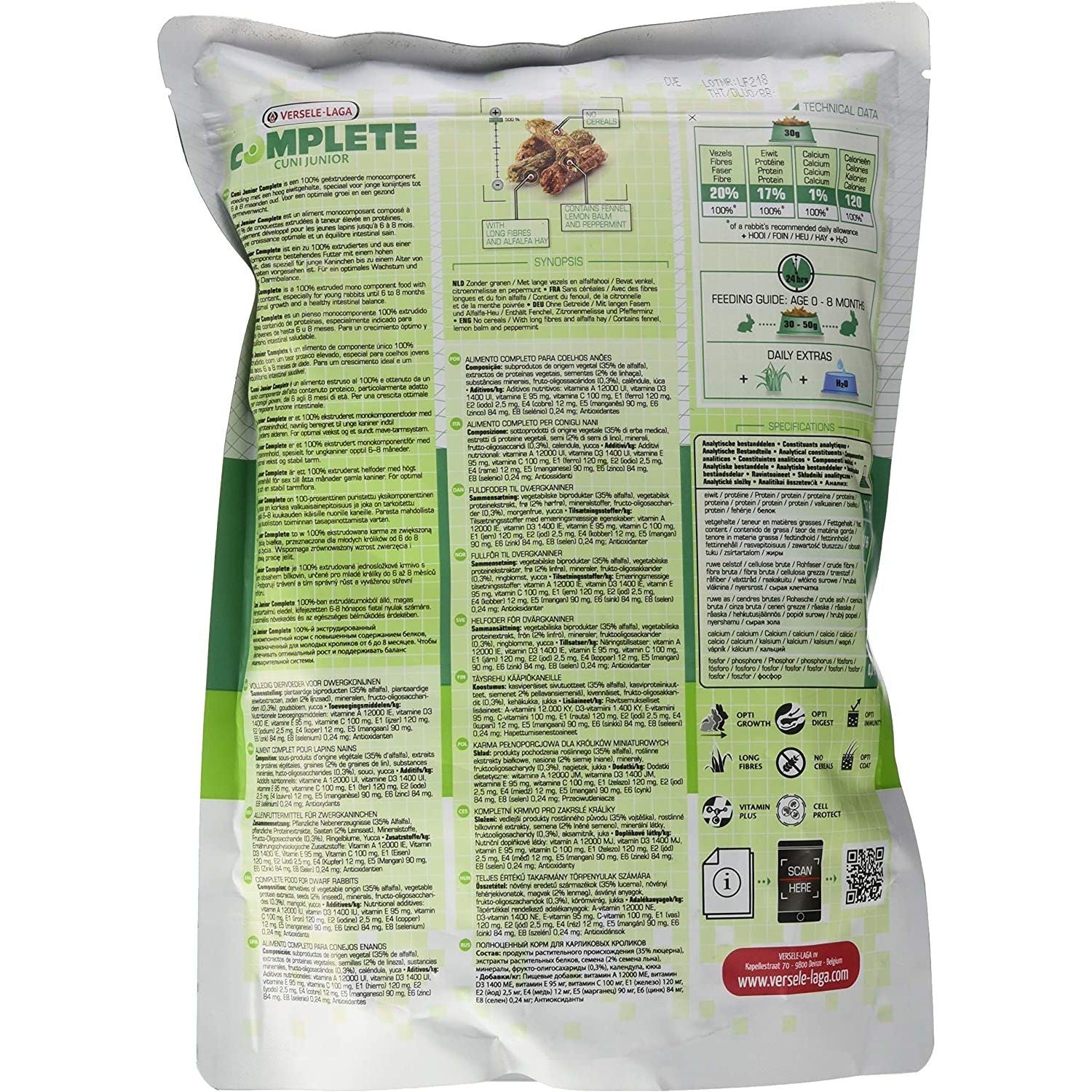 Pienso para conejos jóvenes Versele Laga Complete Cuni JuniorEl pienso para conejos jóvenes Versele Laga Complete Cuni Junior son unas deliciosas croquetas ricas en proteínas para la fase de crecimiento de los conejos, hasta los 6 u 8 meses de edad. Además de su alto contenido proteico, incluye un extra de fibras largas y heno alfalfa que favorecen el crecimiento, así como hierbas para una buena digestión y asimilación. Todo ello está elaborado con la tecnología All-in-one, que evita la mala costumbre de seleccionar los alimentos, habitual en estos animales, y es altamente atractivo para tu mascota, con lo que lo comen con apetito y deleite.Los productos de la gama Versele Laga Complete están enriquecidos con todos los nutrientes que necesita tu mascota para una salud óptima. Sus ingredientes aportan vitaminas, minerales y aminoácidos que favorecen un perfecto estado general y fortalecen el sistema inmunológico. Las fibras largas enteras con prebióticos estimulan su flora intestinal y la salud de sus dientes, ya que las sabrosas croquetas satisfacen el instinto de roer de estas mascotas. Todo ello se ve reflejado además en un pelaje suave y brillante al que contribuye el contenido equilibrado de ácidos grasos omega 3 y 6.VENTAJAS:Comida para conejos jóvenes en crecimiento muy completa y energética.Con tecnología All-in-one que evita la ingesta selectiva.Fácil de digerir, estimula la flora intestinal.Con extra de fibras largas y hierbas para un mejor crecimiento.Beneficia un sistema inmunitario más fuerte y un pelaje más suave y brillante.USO Y ESPECIFICACIONES:Comida para la cría de conejos jóvenes hasta los 6 u 8 meses de vida.Tu mascota debe tener siempre comida y agua limpia y fresca a su disposición.Conserva este producto en un lugar fresco y seco.Dosificación:Las raciones diarias en general entre los 50 y los 80 g.Tamaño/formato: 500 gramos.