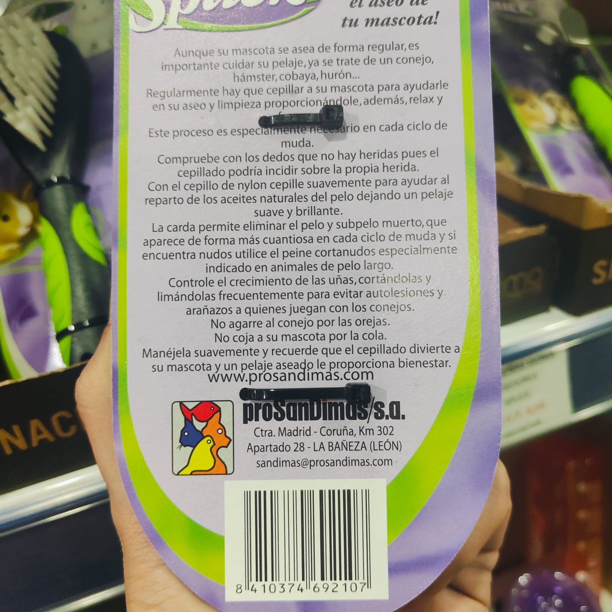 Calidad profesional para cuidar el aseo de su mascota.Aunque su mascota se asea de forma regular, es importante cuidar se pelaje, ya se trate de un conejo, hámster, cobaya, hurón...Regularmente hay que cepillar a su mascota para ayudarle en su aseo y limpieza proporcionándole, además, relax y frescor.Este proceso es especialmente necesario en cada ciclo de muda.Compruebe con los dedos que no hay heridas pues el cepillado podría incidir sobre la propia herida.Con el cepillo de nylon cepille suavemente para ayudar al reparto de los aceites naturales del pelo dejando un pelaje suave y brillante.La carda permite eliminar el pelo y subpelo muerto, que aparece de forma mas cuantiosa en cada ciclo de muda y si encuentra nudos utilice el peine cortanudos especialmente indicado en animales de pelo largo.Controle el crecimiento de las uñas, cortándolas y lijándolas frecuentemente para evitar autolesiones y arañazos a quienes juegan con los conejos.No agarre al conejo por las orejas.No coja a su mascota por la cola.Manéjala suavemente y recuerde que el cepillado divierte a su mascota y un pelaje aseado le proporciona bienestar.