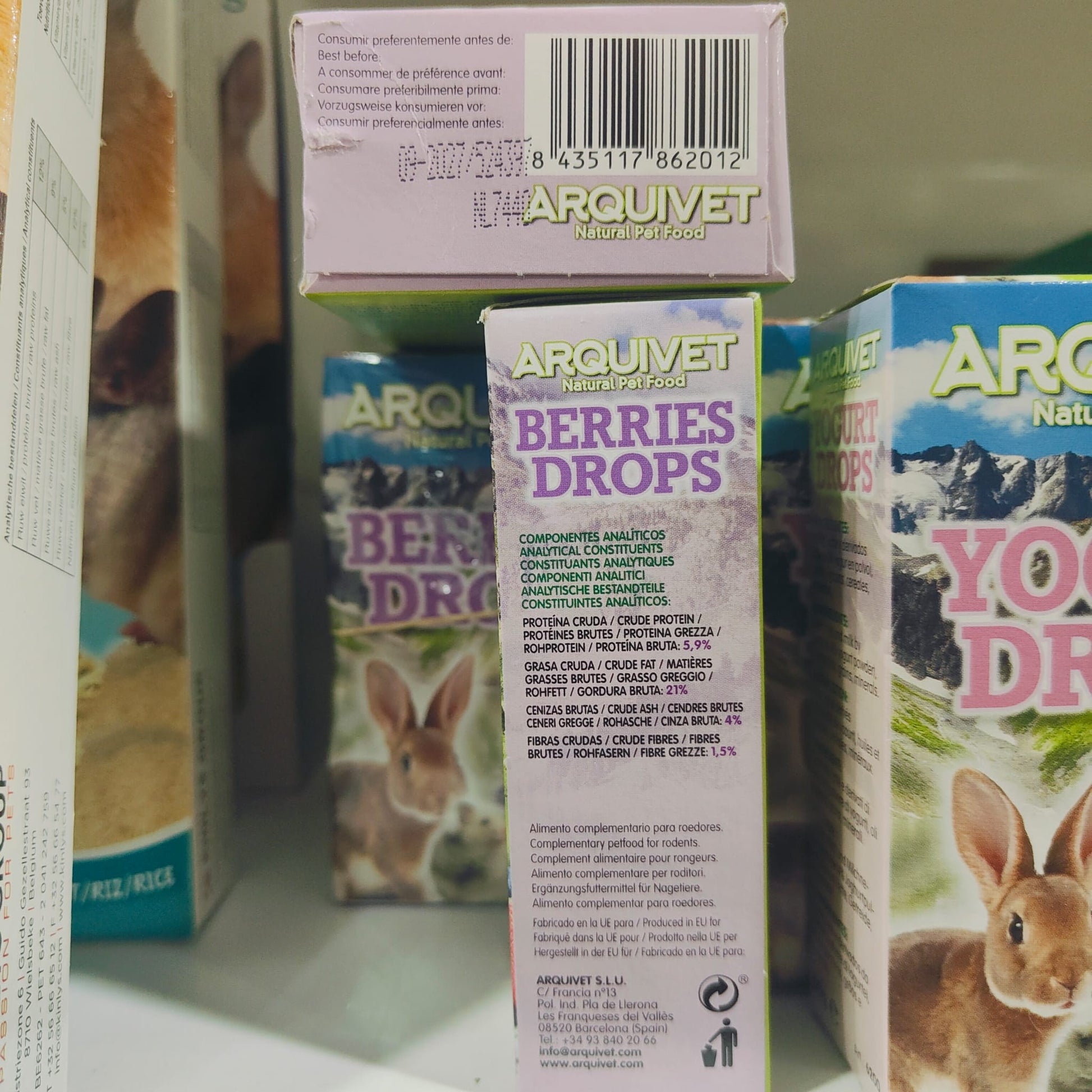 Conejos, hamsters y cobayas adoran los frutos del bosque, por eso Berries Drops es un snack delicioso, apetitoso y un premio saludable.Recomendaciones de uso: 1-3 drops al dia, dependiendo de la edad y tamaño de su mascota. El producto está listo para servir. Tenga disponible agua fresca y limpia en todo momento. Mantener en lugar fresco y seco.Ingredientes: Azucar, leche y derivados lácteos, fruta (4% frutas del bosque en polvo), aceites y grasas, cereales.Componentes analíticos: Proteina cruda 5,9%, Grasa cruda 21%, Cenizas brutas 4%, Fibras crudas 1,5%.