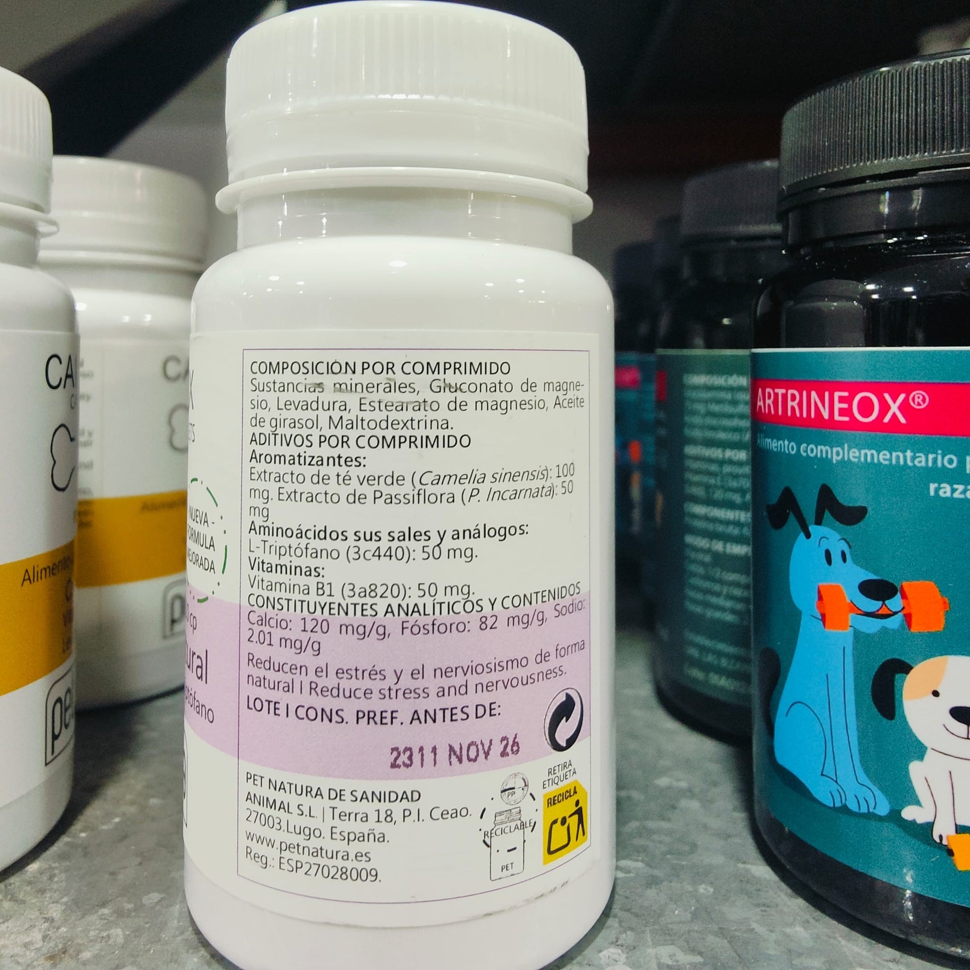 TRANQUILIZANTE NATURAL PARA GATOS Y PERROSALIMENTO COMPLEMENTARIO. PREVIENE Y TRATA PROBLEMAS DE COMPORTAMIENTO RELACIONADOS CON EL ESTRÉSSuplemento nutricional tranquilizante para perros y gatos que previene y ayuda a controlar el comportamiento y las reacciones previsibles de los animales ante situaciones estresantes provocadas por diferentes causas, como: ruidos (fuegos artificiales, tormentas, etc.), ansiedad por separación, fobia a los viajes, mudanzas, visitas al veterinario o a la peluquería, estancias en residencias caninas, soledad, competiciones, exposiciones, accidentes, post operatorios y en general cualquier cambio en la rutina diaria del animal. Puede utilizarse en situaciones en que el estrés permanente le provoque alteraciones físicas (en este caso, consulte con su veterinario). 1. EXTRACTOS DE PLANTAS: CAMOMILA, VALERIANA Y OTRAS con efecto sedante y antiespasmódicos.2. L-TRIPTÓFANO: a partir de este aminoácido se sintetiza el neurotransmisor SEROTONINA que proporciona calma, sensación de bienestar, buen humor, control de la agresividad, control del miedo y el estrés. Nos ayuda a dormir bien puesto que es precursor de la hormona melatonina que regula los ciclos del sueño. 3. MAGNESIO: también es necesario para la síntesis de serotonina y además posee un efecto relajante muscular.ADMINISTRACIÓN Y DOSISVía oral. Perros: primeros 15 días, 1 comprimido por 10 kg de peso, dos veces al día, pasados 15 días, 1 comprimido por 10 kg de peso al día. Gatos: 1 comprimido al día.PRECAUCIONESMantener bien cerrado el envase después de cada uso. Guardarlo al abrigo de la luz, la humedad y las temperaturas extremas. Mantener fuera del alcance de los niños.USO EXCLUSIVO EN ANIMALESPerros y Gatos.PRESENTACIÓNTarros de 20, 60 y 300 comprimidos.